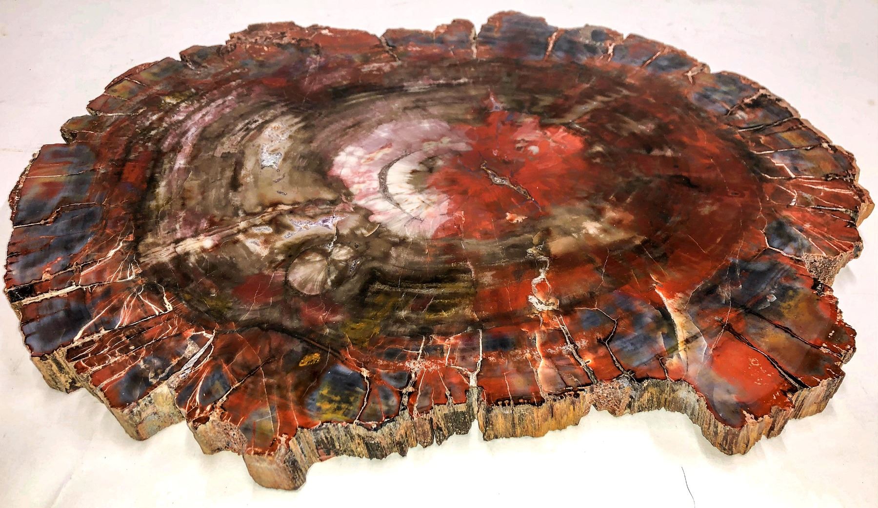 Gorgeous polished large slab of the classic deep reds and orange-yellow, including a section of the classic brown-gray petrified wood from the area near the famous Petrified Wood National Park. 13 x 18" in diameter. Spectacular!