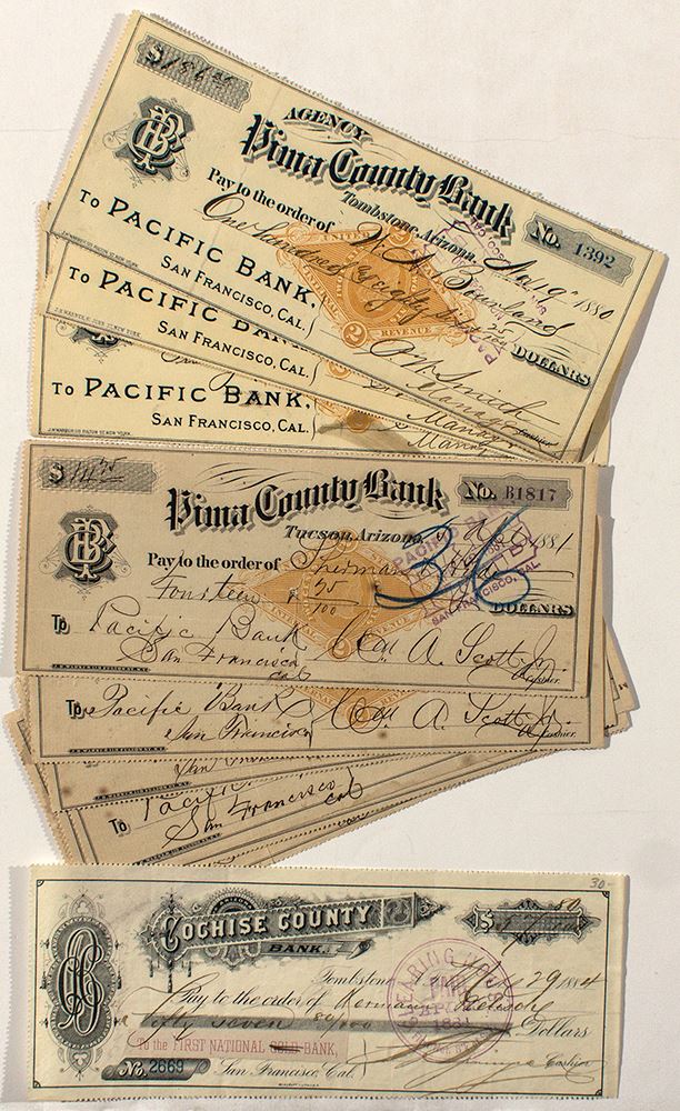 Lot of 11. Ten have RN-G: Pima County Bank, 1880-1881, three from Tombstone, the rest Tucson. One has no RN: Cochise Bank, Tombstone, 1884. Cut cancels and light soiling. (Prag Collection)