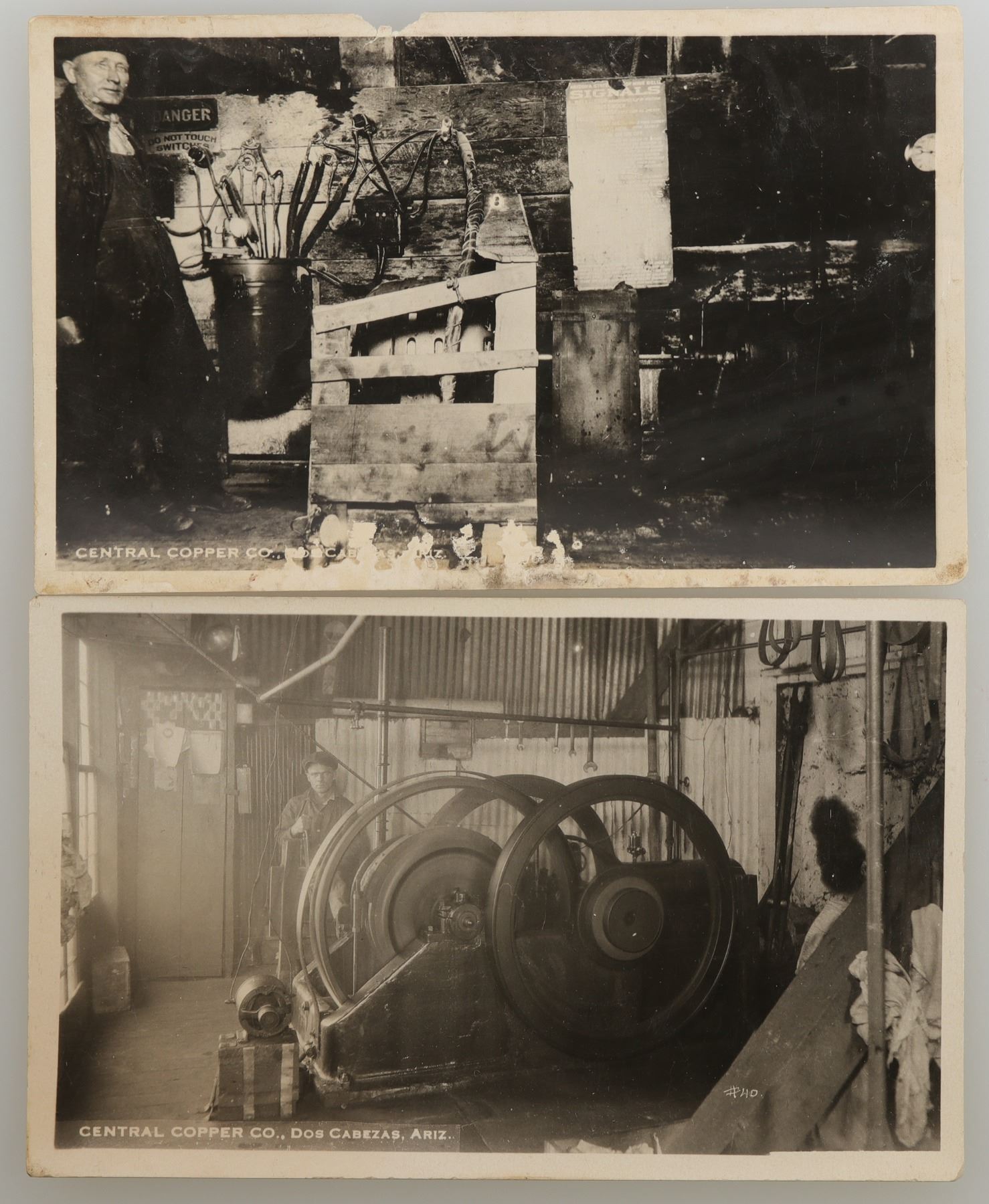 This lot has two real post cards of the Central Copper Co. mining operation in Dos Cabezas, Arizona. One card shows spinning hardware, in excellent condition. The other card depicts a miner with the signal sign in the background. Chip missing top center, loss of color bottom center, card is in fair to good condition. C. 1920's. Please see photo for details. Arizona
