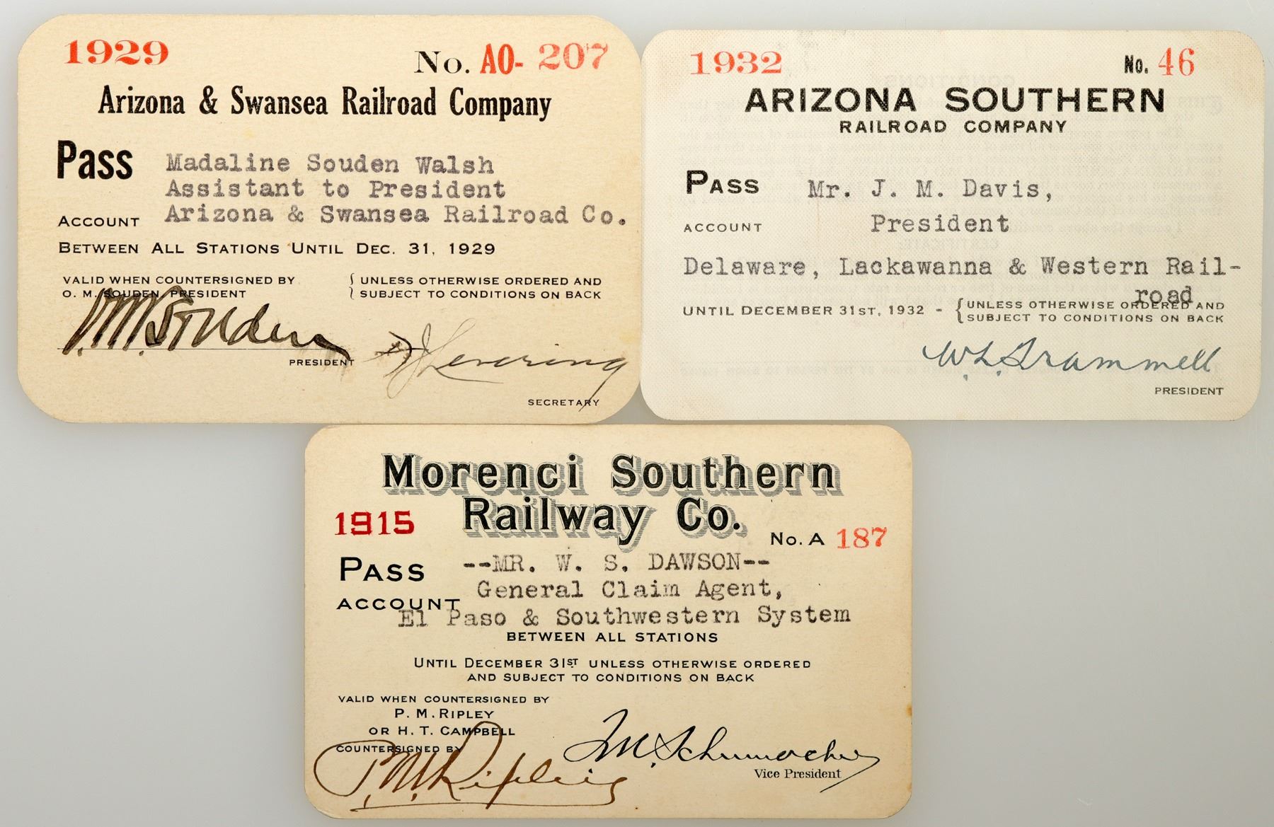 Lot of 3 different. 1) Morenci Southern Railway Company. Pass issued for 1915 to WS Dawson of El Paso & Southwestern System. Preprinted signature of the vice president. Countersigned by PM Ripley. Mining railroad built in 1901 by the Detroit Copper Mining Co., a subsidiary of Phelps Dodge Corporation. From the mines at Morenci to Guthrie, 1901-1922. 2) Arizona & Swansea Railroad. Pass issued for 1929 to the assistant to the president. Signed by president Souden. This 21 mile line operated from Bouse to Swansea, beginning in 1908. Swansea served as a mining town as well as a location for processing and smelting the copper ore taken from the nearby mines. 3) Arizona Southern Railroad. Pass issued in 1932 to JM Davis, president of the Delaware, Lackawanna, & Western Railroad. Signed by the president. Red Rock, Ariz., on the Southern Pacific Company, in a southwesterly direction to Silverbell, Ariz., where the mines of the Imperial Copper Company were located.