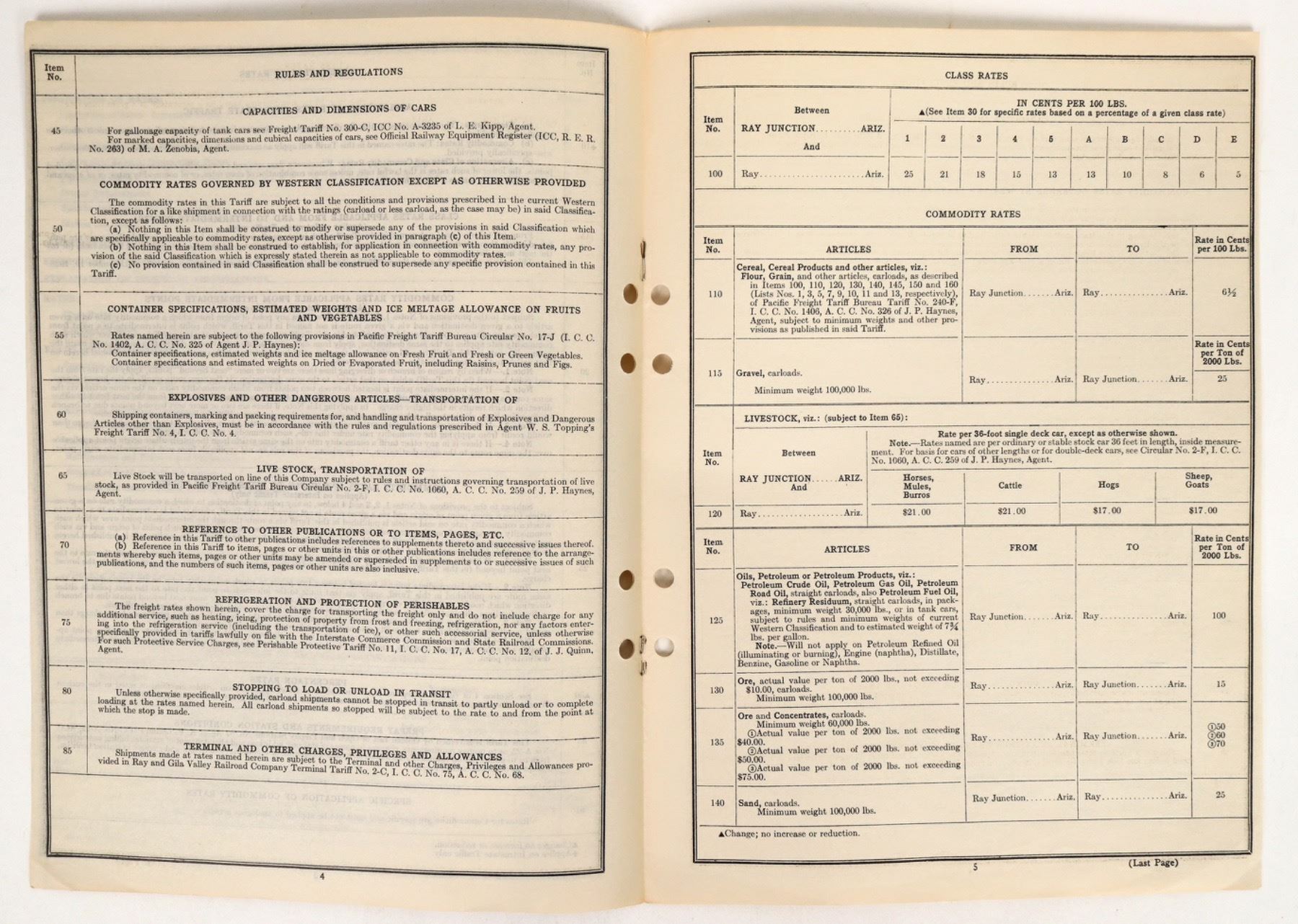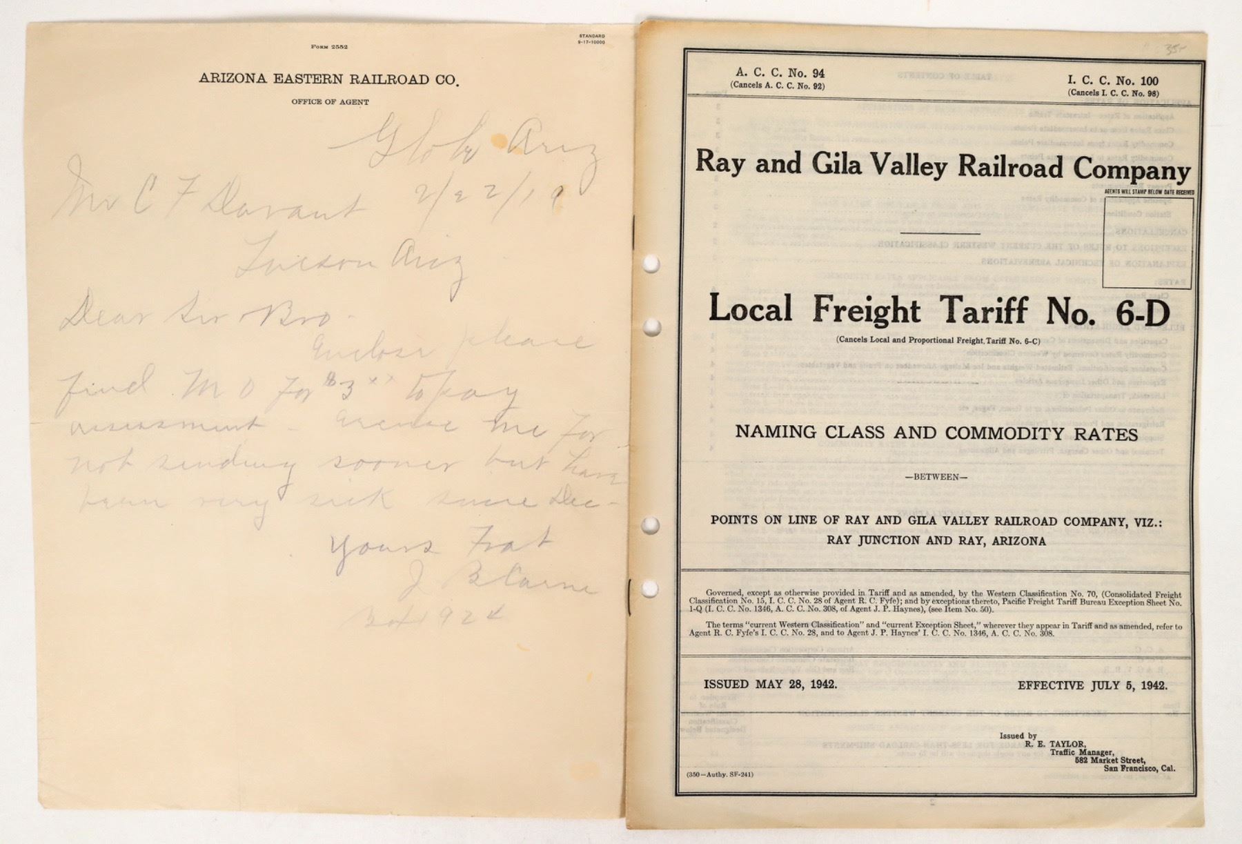 1942 Ray and Gila Valley RR local freight tariff pamphlet, 1919 Arizona Eastern RR letterhead.