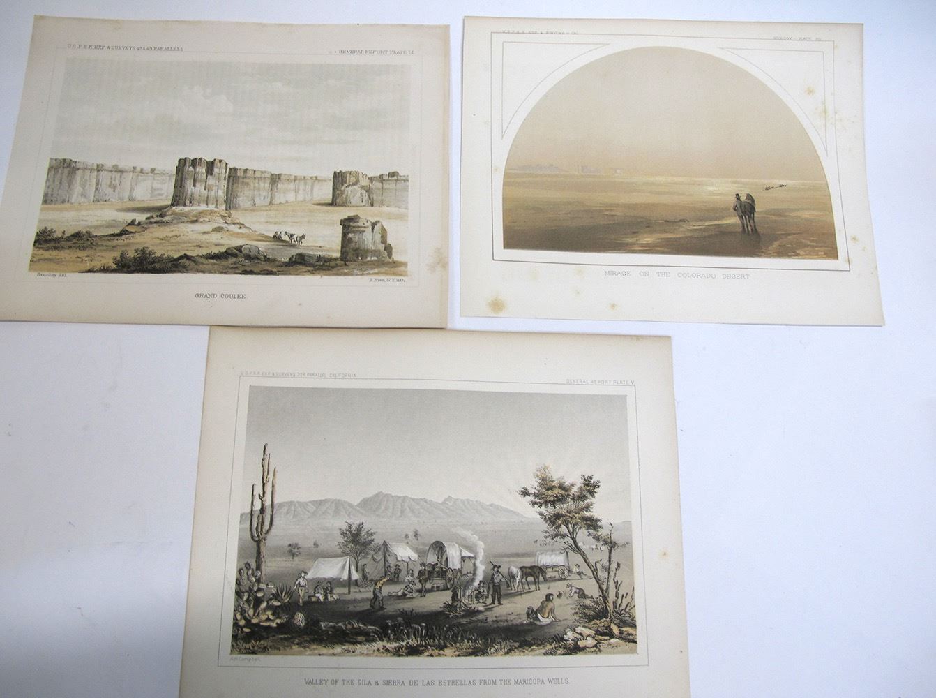 3 tinted 8.5" x 10.75" prints of Arizona scenes-Valley of the Gila & Sierra de las Estrellas from the Maricopa Wells plate V, Mirage on the Colorado Desert plate XII, Grand Coulee plate LI. Some toning. Date: c. 1850's Location: Arizona HWAC # 54474
