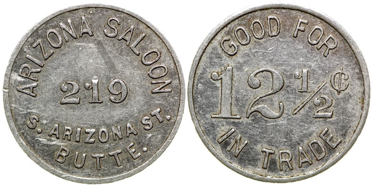 Obv.: Arizona Saloon / 219 / S. Arizona St. / Butte; Rev.: Good For / 12 1/2c / In Trade. Rd., Alum, 20mm, R-8. City: Butte State: Montana Date: ID: 36347