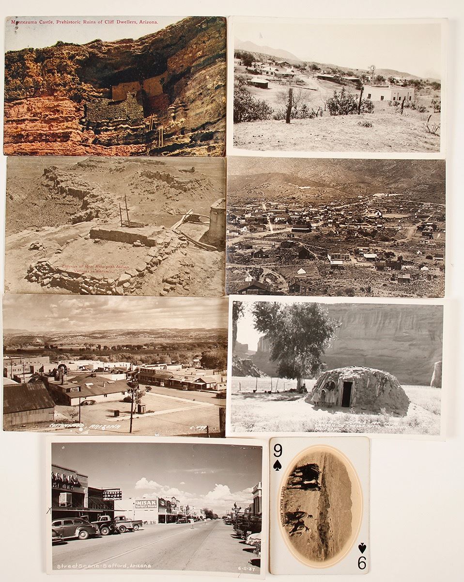 Lot of 8 wit mix of RPCs and color illustrations. These postcards are showing views of Cottonwood, Stafford, Chloride, Oracle, and Seligman. Date: Location: Arizona HWAC# 63830