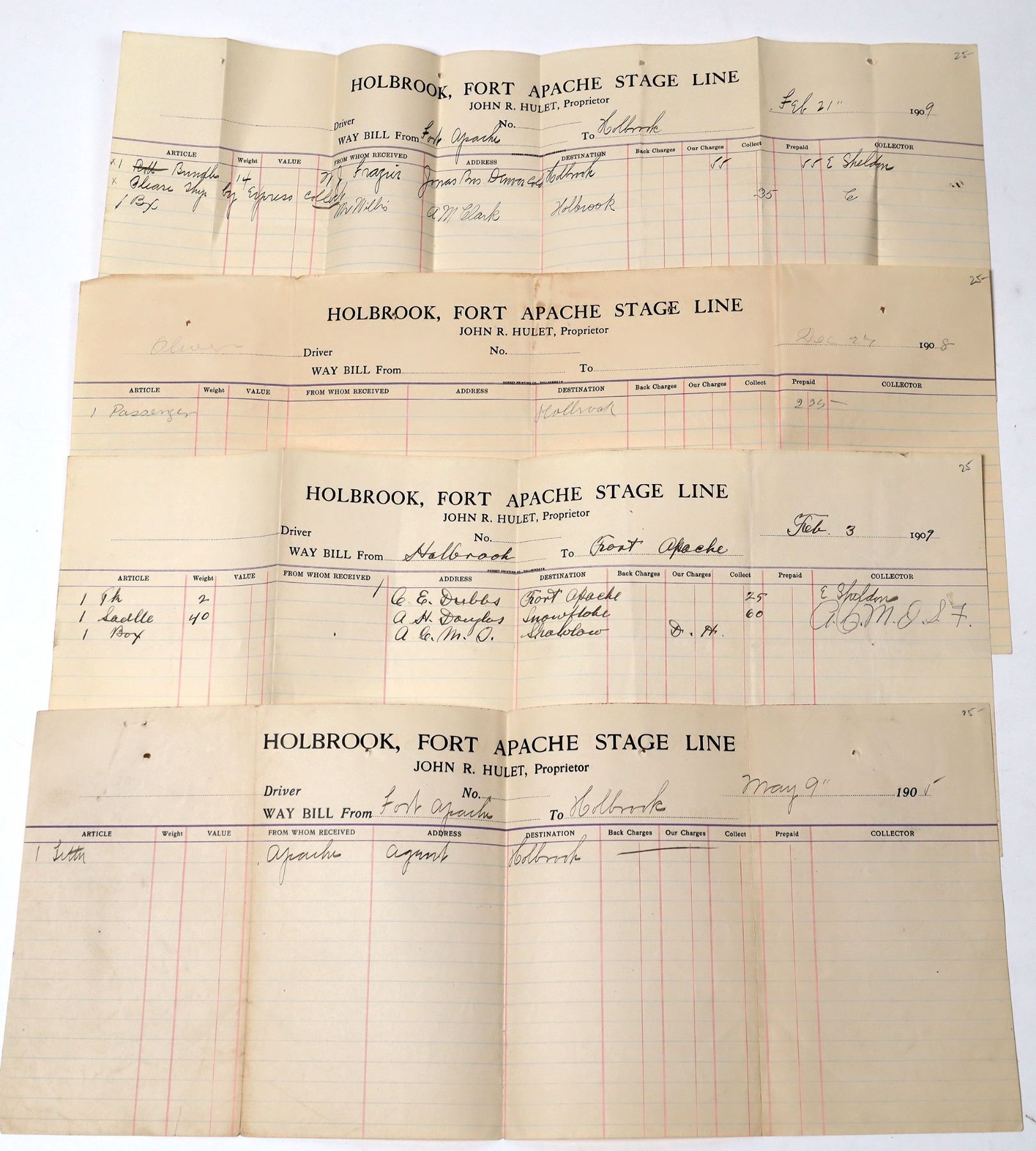 4 Holbrook, Fort Apache Stage Line waybills, 1905, 1907, 1908, 1909. To and from Fort Apache and Holbrook.