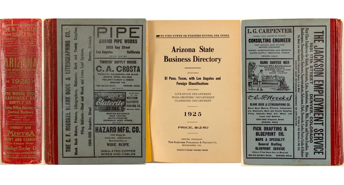 Arizona State Business Directory Including El Paso, Texas with Los Angeles and Foreign Classifications Including Live Stock Department, Wool Growers' Department, Classified Department. The Gazetteer Publishing & Printing Co. Denver, Colorado. Includes index to advertisements and list of post offices and towns. 691 pages. Condition: binding starting to come loose, pages very clean. Some wear to spine. Rarity: [ii]