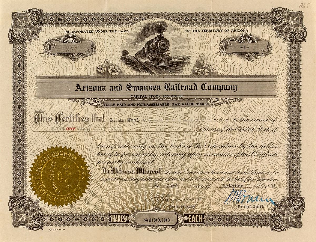 Rare. Inc. in the Territory of Arizona. No. 357, issued for one share to B.A. Weyl on Oct. 23rd, 1931. Signed by the president and secretary. Not cancelled. Gold seal, ornate border and locomotive vignette. Folds, but clean. 8.25" x 11" (Prag Collection) City: State: Arizona Date: 1931 ID# 34645