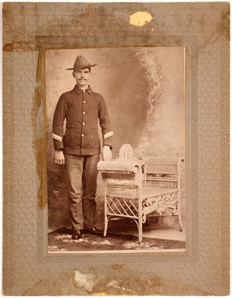 Arizona Terr. Soldier written on back of photo "John C. Cranking(?), Has reenlistment stripe on cuff. The Has condition issues at bottom and top, looks to be from wear. 2.5" x 3.5". Date: c. 1895 Location: Arizona HWAC# 57917