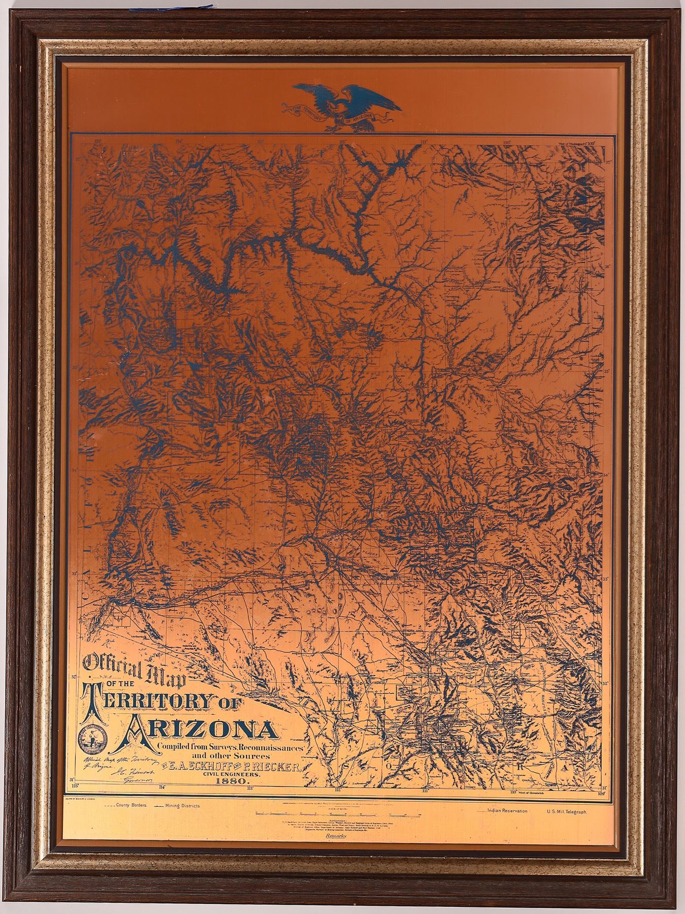 "Official Map of the Territory of Arizona, From Surveys... by Eckhoff & Riecker, Civil Engineers 1880". At left "Official Map of the Territory of Arizona, Signed JC Freemont". Overall frame size 28.5x38". c. second half of the 20th century. Very fine. Sherman Collection.
