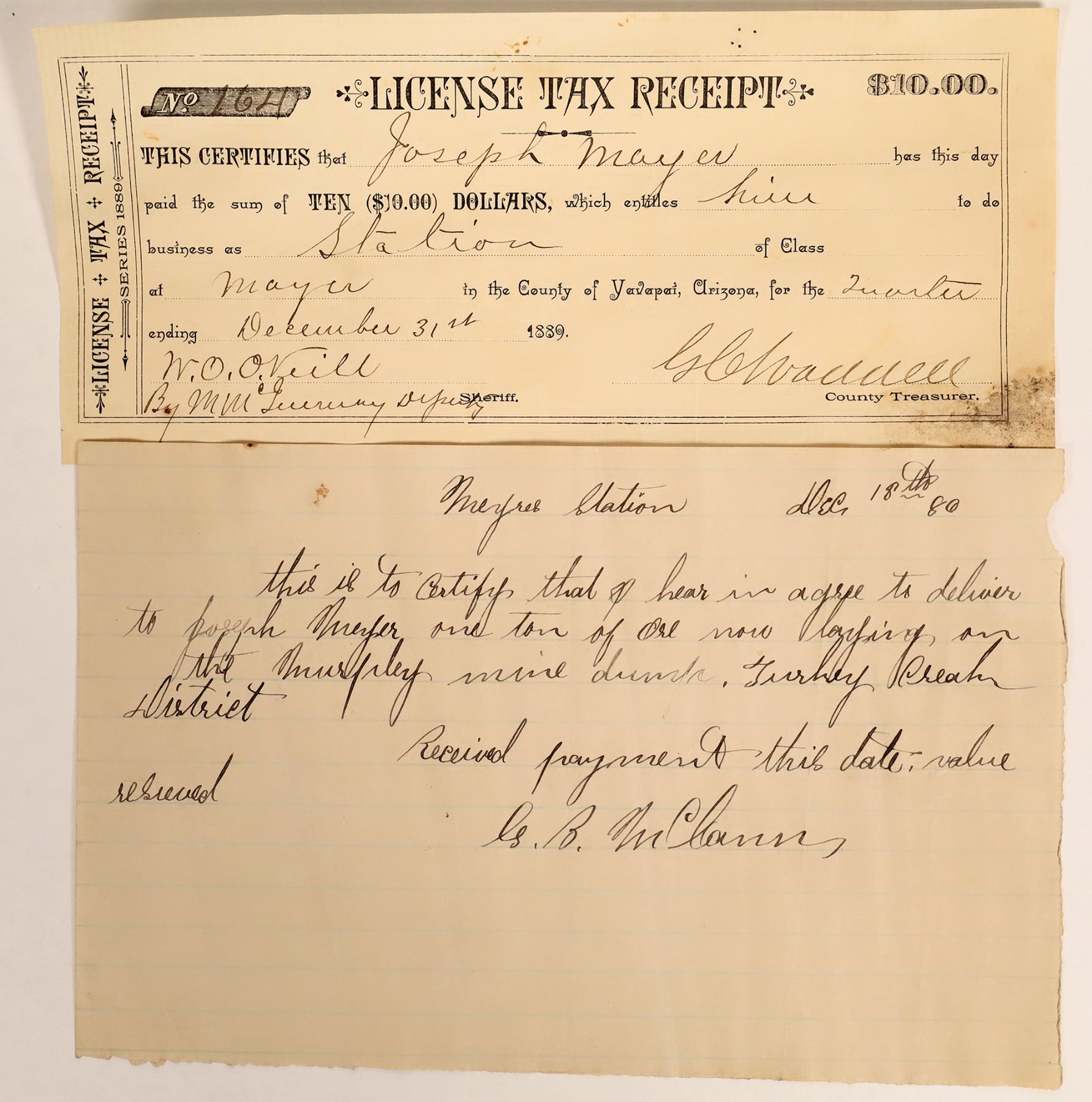 Two interesting pieces of Arizona Territory ephemera, including a $10 license tax receipt that allows one Joseph Mayer to do business at the station in Yavapai County. There's also a receipt for a one ton ore shipment. It's dated December 18, 1880.