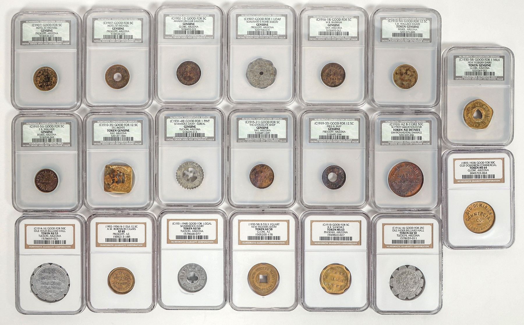 Dealer lot of twenty different certified tokens from Arizona. Thirteen are NCS Genuine; seven are NGC graded from XF 40 to MS 64. Mandolin Club Saloon; Idle Hour Billiard Hall. Many different towns: Globe, Bisbee, Ray, Prescott, Tucson, Phoenix.