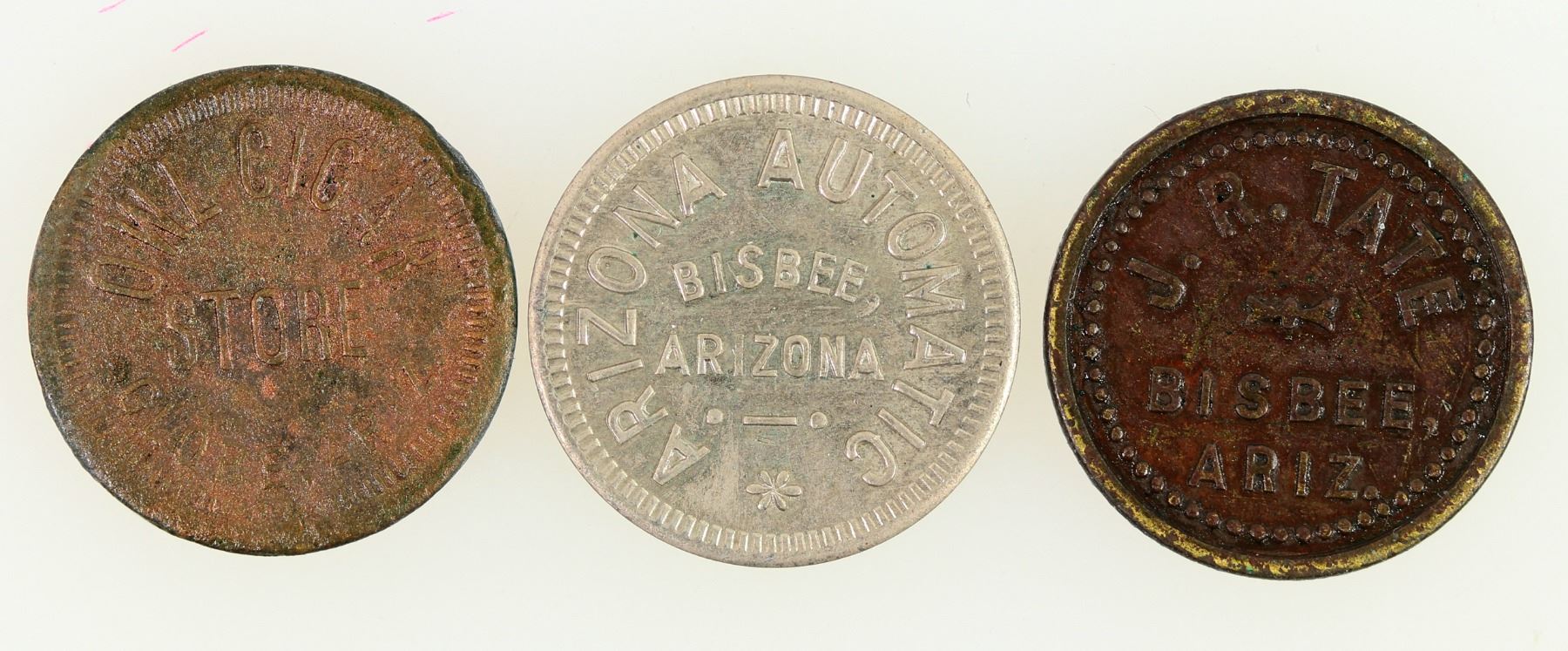 Three Arizona tokens: 1) ARIZONA AUTOMATIC / BISBEE, / ARIZONA // GOOD FOR / 5c / IN TRADE; Wm, rd., 21 mm. 2) J.R. TATE / BISBEE, / ARIZ. // GOOD FOR / 5c / IN TRADE; Br., rd, 21 mm. 3) OWL CIGAR / STORE / GLOBE, ARIZ. // GOOD FOR / 5c / IN TRADE; Br., rd., 21 mm.