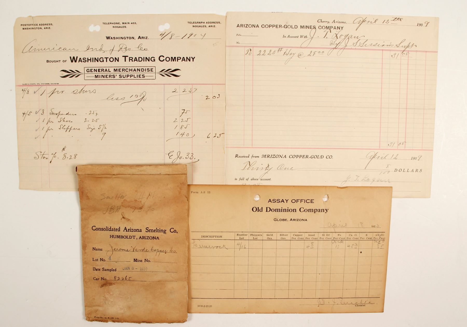 Four pieces from Arizona towns. Billhead from Washington Trading co at Washington, AZ, 1904; receipt from AZ-copper gold mines at Cherry, AZ 1909; assay receipt fro m Old Dominion at Globe; assay bag (paper) from Humboldt, AZ (Consol AZ Smelting Co., 1920).