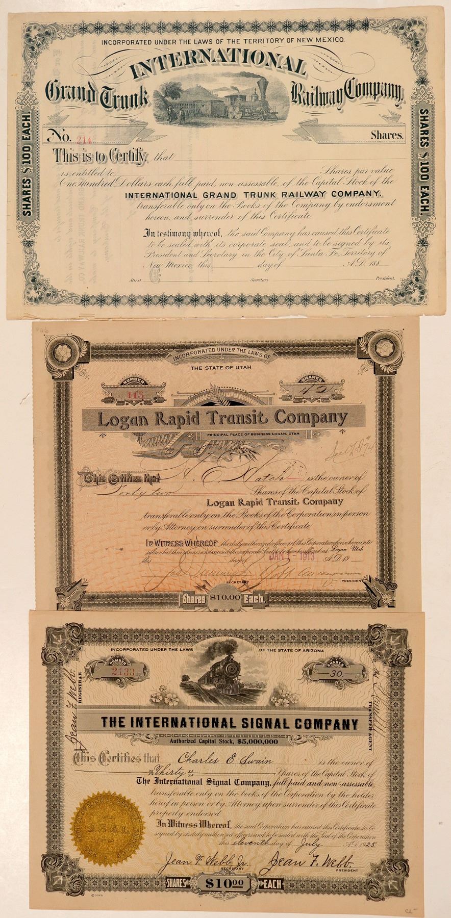 2.The International Signal Co incorp State of Arizona. #2133, I/U, 30 shared @ $10.00 par issued July 11, 1925, signed Jean F. Webb president. BLACK, embossed gold seal. Vignette top 4-4-0 near frontal ll-r. Gold underprint. GOES printer.