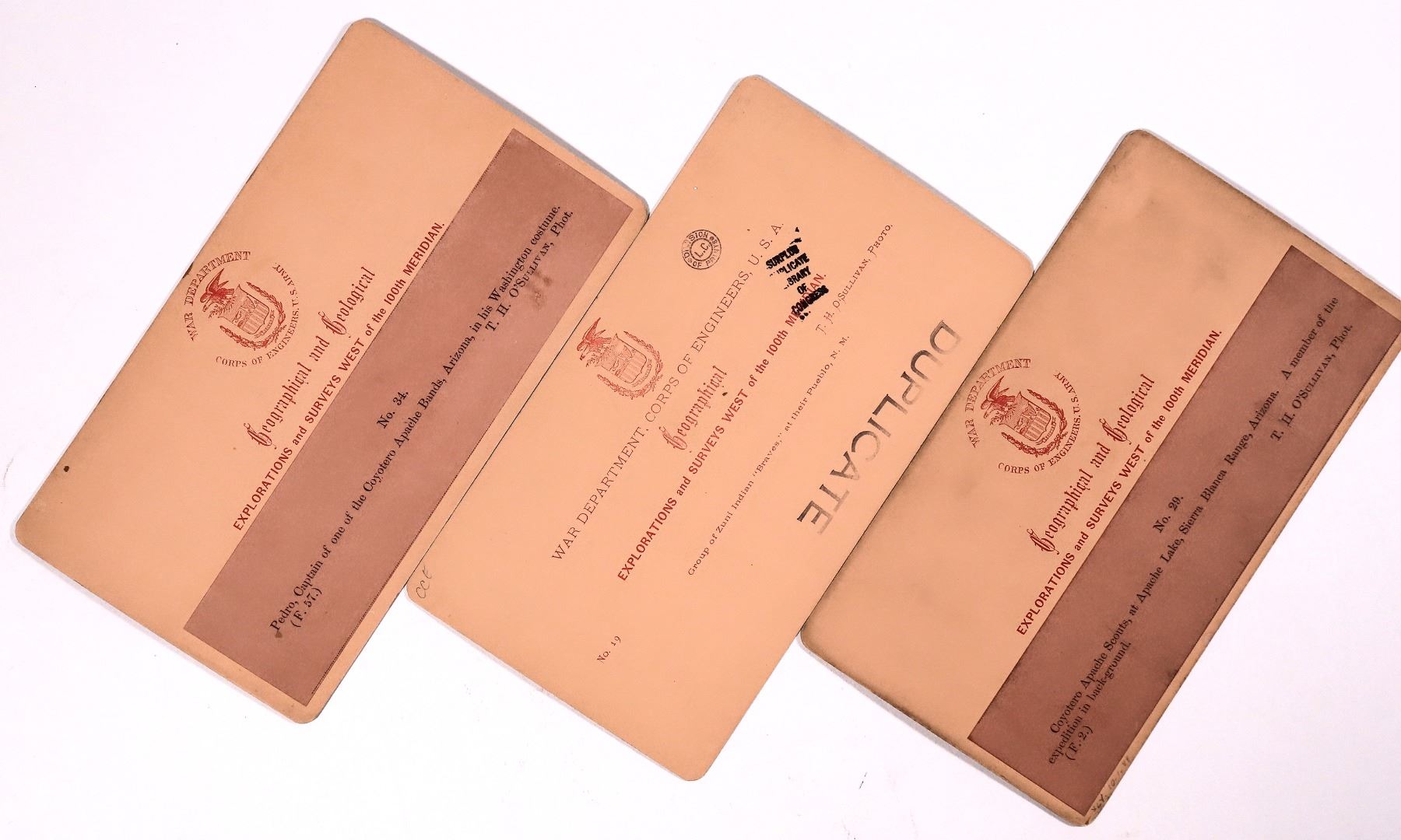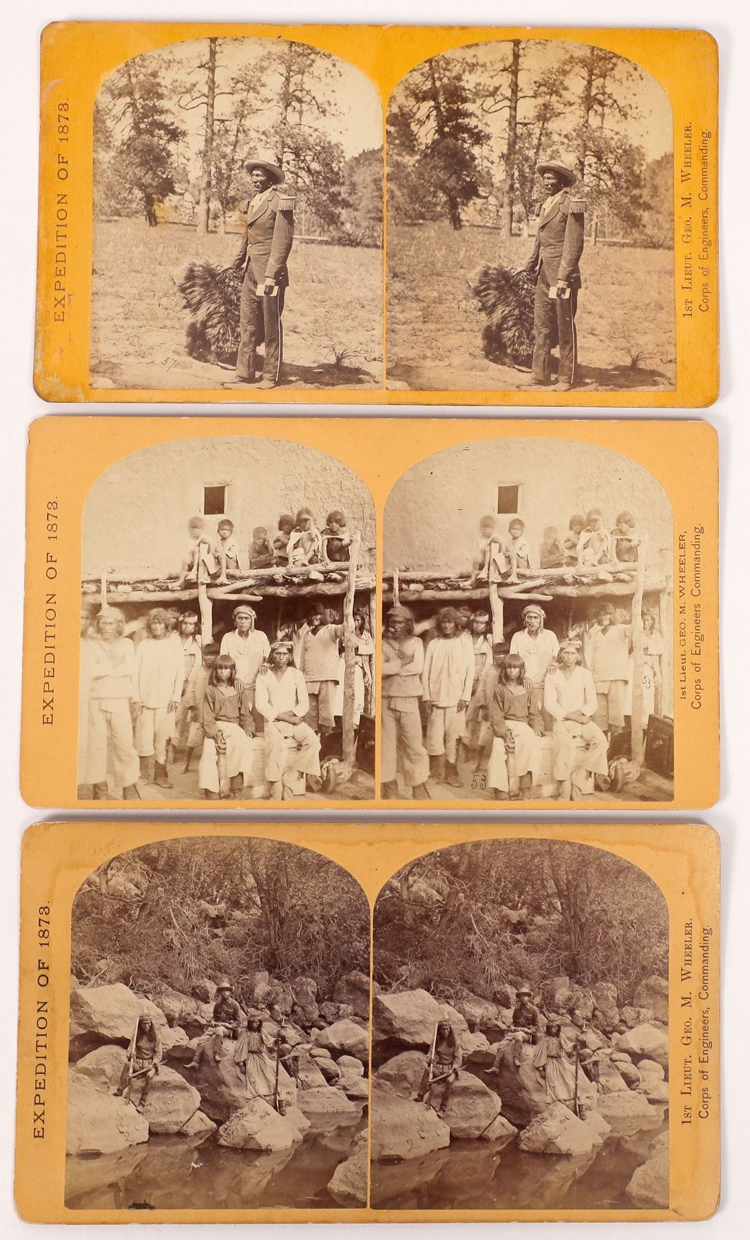 Three key early stereoviews in excellent condition by western photographer TH Sullivan for the 1873 George M Wheeler Expedition through the West. The Wheeler survey photos are famous for introducing the rural American west to America in the 1870s. This group is comprised of no19, group of Zuni Indian Braves at their Pueblo in New Mexico. This photo shows Sullivan's large format camera sitting in the lower right corner of the photograph. No 29 Coyotoro Apache Scouts at Apache Lake, Sierra Blanca range Arizona. A member of the Wheeler expedition is shown sitting on a rock behind 2 Indians with his rifle. No. 34 Pedro, Captain of one of the Coyotoro bands in his Washington Costume.