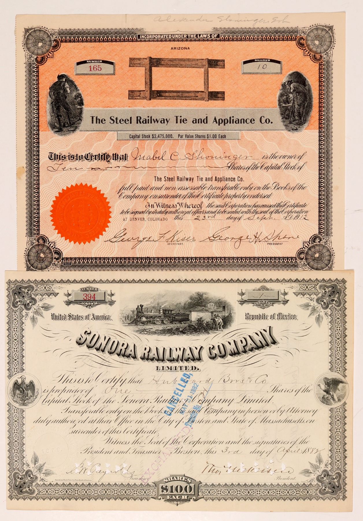 2 certificates. 1. Sonora Railway Co. incorp 1879 Mexico. #394, I/C, 1 share common stock issued April 3. 1882. Signed president. BLACK, embossed seal, vignettes: 4-4-0 loco Progress r-l @ depot, left eagle w/snake, right eagle wings spread. American Bank Note Co. printer.