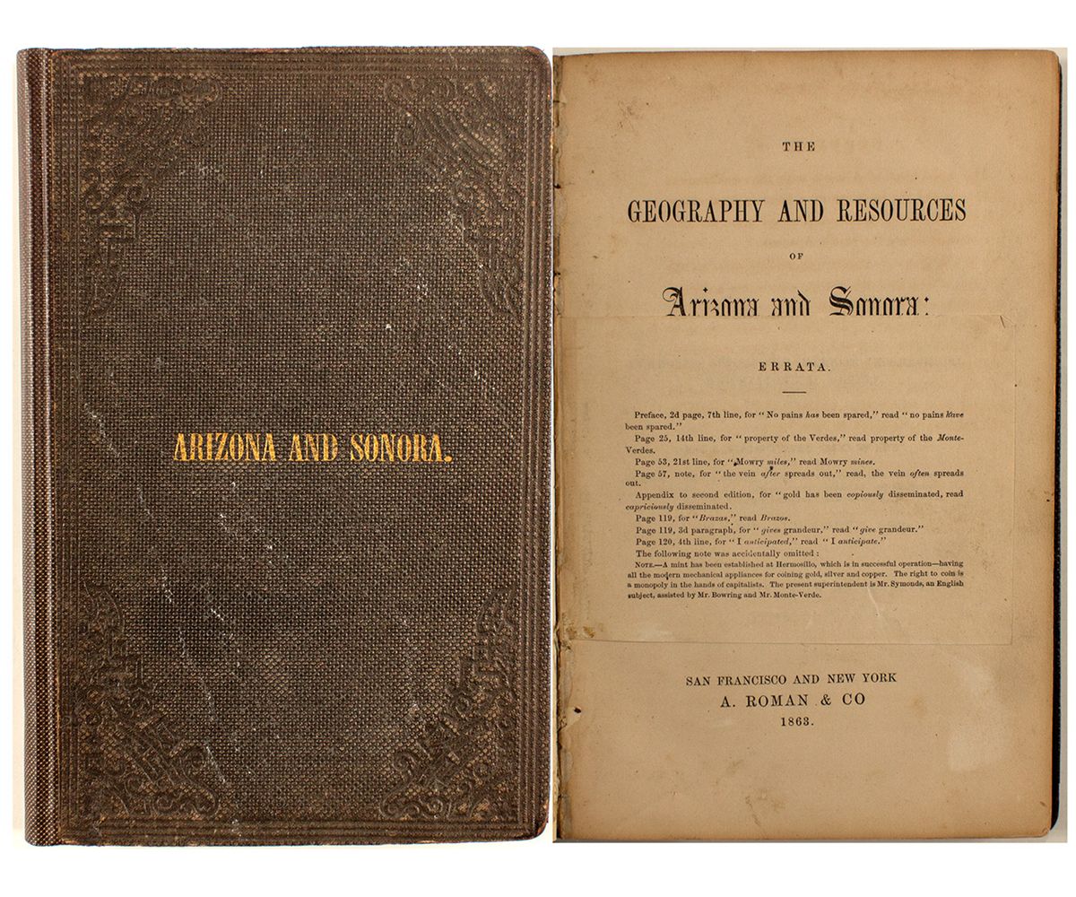 The 1863 volume. 124pp. Typical 6 x 9”, brown boards, gilt lettering, professionally rebacked with replaced fly pages. A. Roman & Co., San Francisco and New York. Contains the short errata page tipped in at title page. This edition is apparently the “second edition”. The cover page states “A New Edition, with an appendix”. The first was apparently published Feb. 3, 1859, though I have never seen one of these, and consider them exceptionally rare (fh). The 1863 edition is very rare, while of the three, the 1864 edition is the most commonly seen. The 1863 work is unarguably the best first-hand description of early Arizona. He discusses the various mining companies there since 1855 (Sonora Exploring and Mining) and others, especially around Tubac, inclusive of “the great Heitzelman mine.” The 1863 edition differs from the original 1859 edition substantially, and is a stand-alone reference. There are two appendices, the first a discussion of the Pacific Railroad bill. The second, a nine page discussion of Arizona 1859-1863, followed by the all-important, 63 page tome “The Mines of Arizona” (and northern Mexico) “written February, 1861”. That, in turn is followed by various correspondence that backs up Mowry. This is the most important work of the period for Arizona mining history.City: County: State: AZDate: