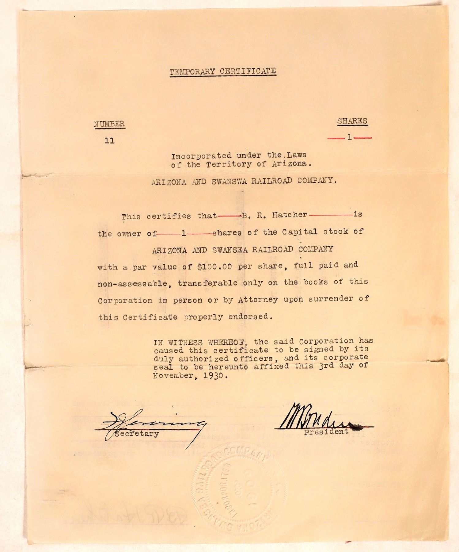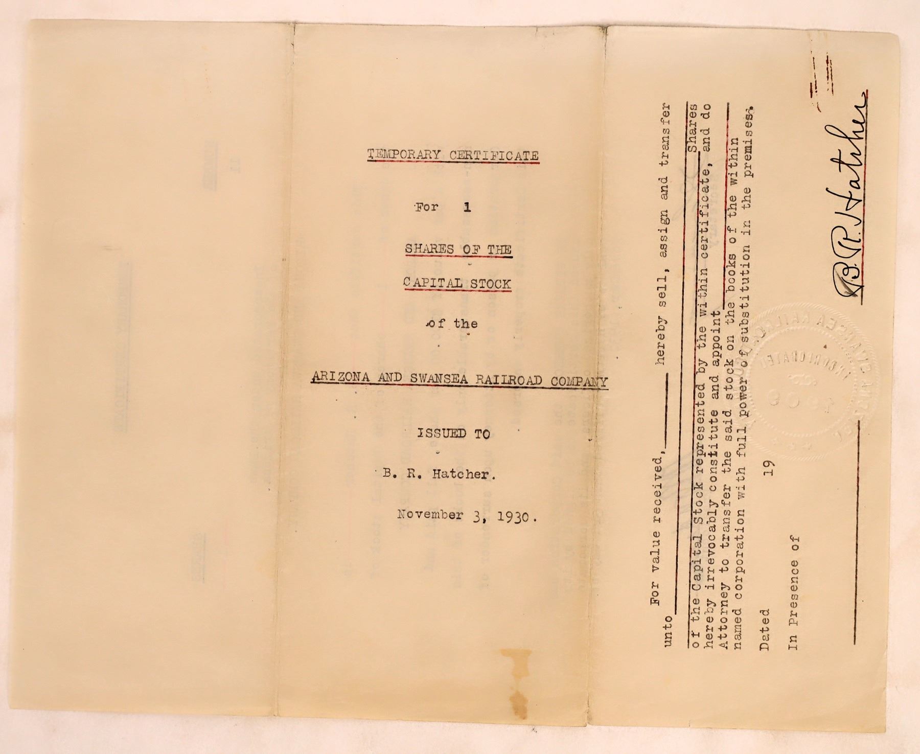 Rare Arizona and Swansa Railroad temporary stock certificate, 1930. They ceased operation in 1931. Arizona Ken Prag Collection