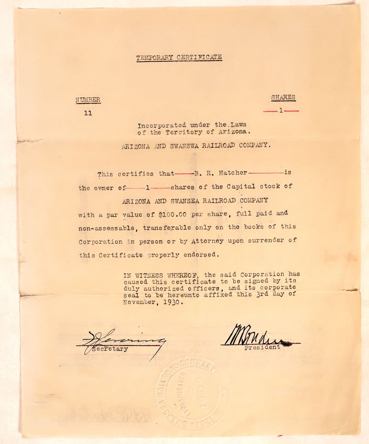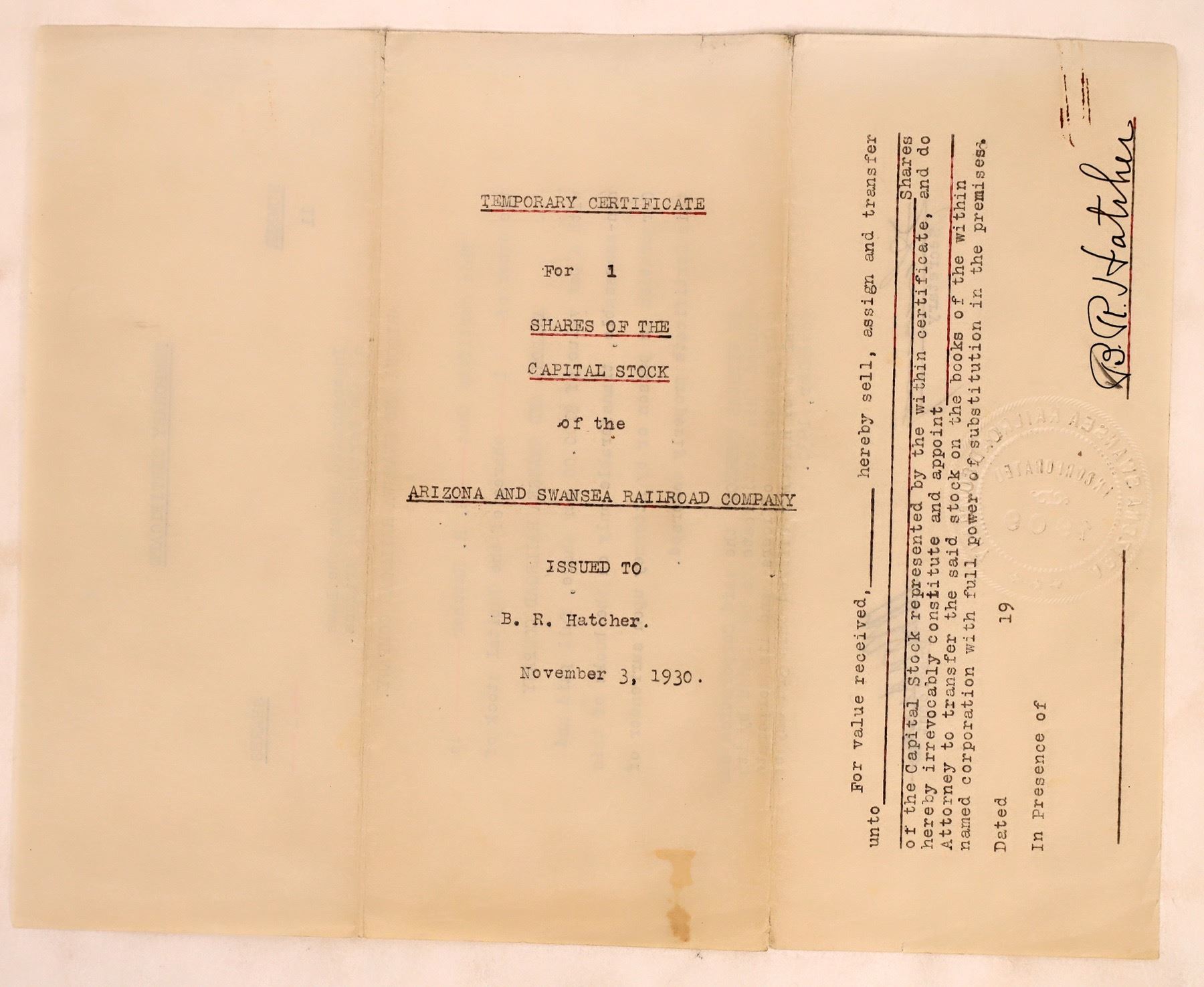 Rare Arizona and Swansa Railroad temporary stock certificate, 1930. They ceased operation in 1931.
