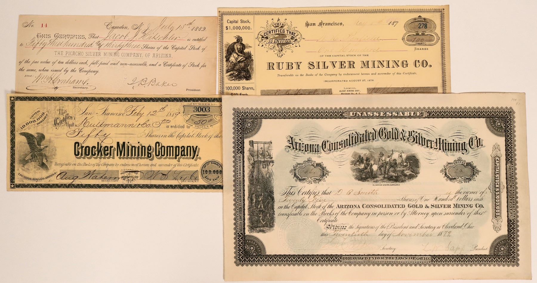 1) Crocker Mining Company Stock- # 3003 for 50 shares to Cullmann & Company trustees. Signed by Aug. Waterman and WS Lyle president. Dateline San Francisco 1889. Incorporated January 17, 1884. Location Pima Co. Arizona. 2) Arizona Consolidated Gold & Silver Mining Company Stock- # 62 for 25 shares to DB Smith. Signed by Calkins and president LW Sapp. Dateline Cleveland 1879. Location Globe District, Arizona Ter. Quartz mining vignette. WJ Morgan & Co. Engravers, Cleveland. 3) Ruby Silver Mining Company Stock- # 278 for 100 shares to WH penfield. Signed by EG Freeland and president Stephen Wing. Dateline San Francisco 1880. 4) Picacho Silver Mining Company Stock- Very early number 14 for 5,333 shares to Jacob Hilschler. Date line Camden July 15, 1882, Incorporated July 8th, 1882.