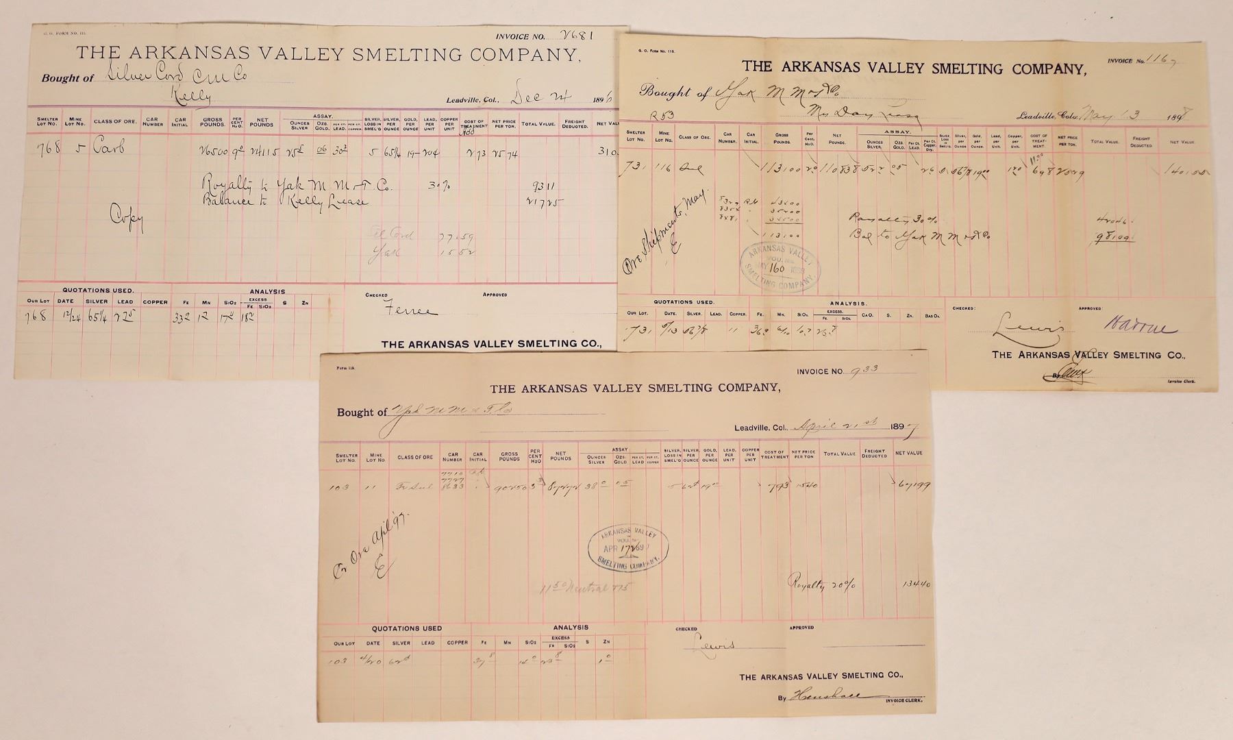 Lot of 3. 1) 1896. #2681. For the Silver Cord Mining Company (Royalty in Yak M&M). Net value $310.36. Signed by Ferree. 2) 1897. #933. For the Yak M&M Company. Net Value $671.99. Signed by Lewis. 3) 1898. # 1167. For the Yak M&M Company. Net value $1401.55. Signed by Lewis. Each 8.25 x 14" Leadville Colorado Franklin Collection