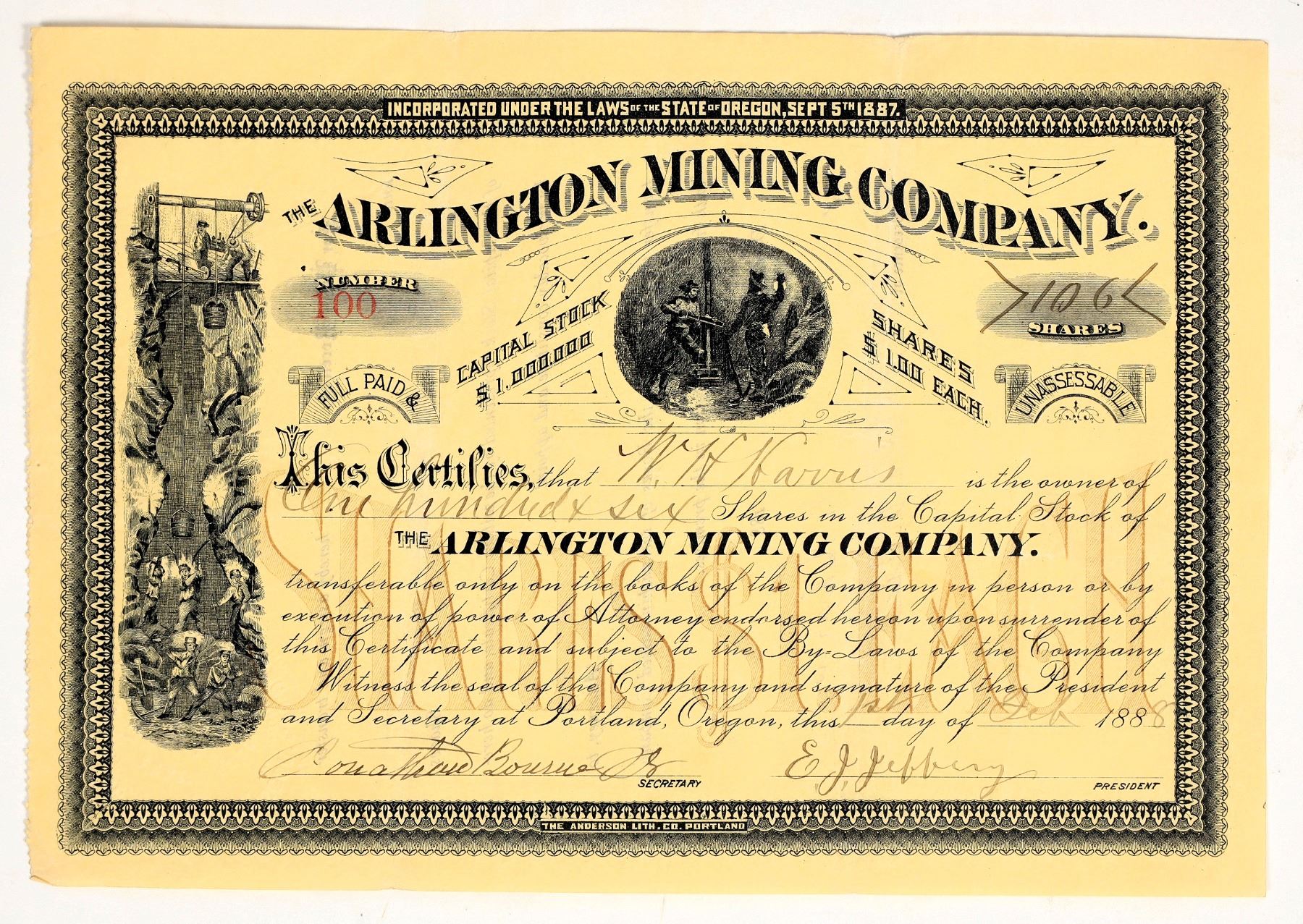 Inc. in Oregon, 1887. No. 100, issued for 106 shares to WH Harris in 1888. Signed by president EJ Jeffrey and secretary Jonathan Bourne. Not cancelled. Black border and print on yellow paper. Two nice mining vignettes. Folds, pinholes. 6.75 x 9.75" Although dateline Portland, Oregon the mine was located in the Conconully district of central Okanogan County in Washington. Jonathan Bourne, a Portland, Oregon lawyer obsessed with mining fever, bought a total of twenty-seven claims near Ruby at Loop Loop in 1888. Heir of a wealthy New England whaling and manufacturing family and member of Portland's high-class Arlington Club, he soon had a chokehold on more of the mining district than anyone else did. [ghosttownsuse.com]