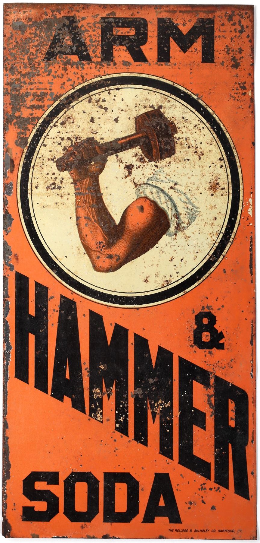 Orange and black Arm & Hammer metal sign by Kellogg & Bulkeley Co. 13.5x6.5". Moderate wear to front.