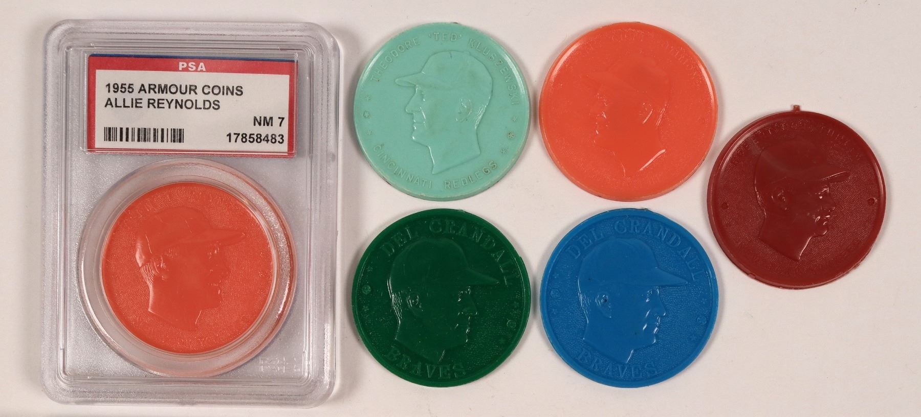 Lot of six plastic coins of star ball players of the day, inserted into Armour Hot Dog packages in 1955, 1959 and 1960. One is graded NM7 by PSA: Allie Reynolds. The others are: 2 Del Crandall (C, Braves) green and blue, Curt Simmons (P, Phillies), Bob Turley (P, Yankees), Ted Kluszewski (Inf., Reds).