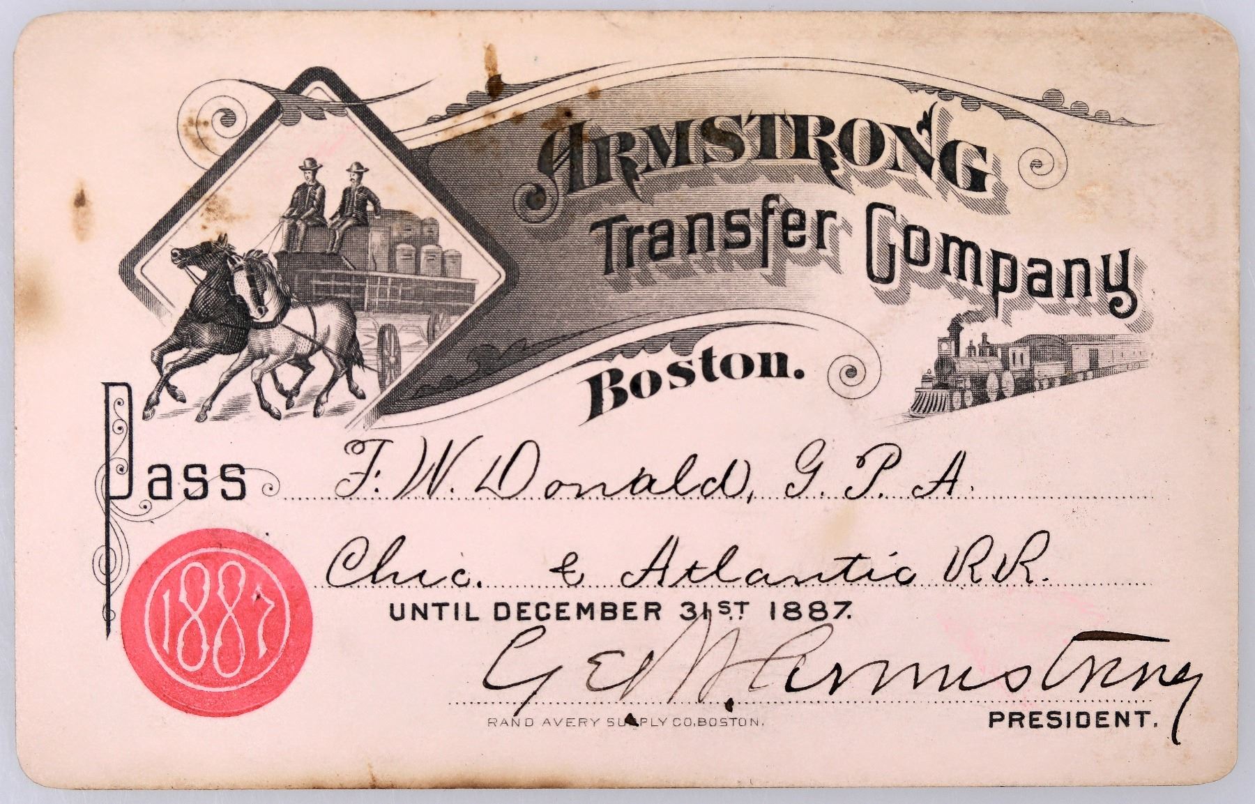 Pass no. 1158, issued for 1887 to FW Donald of the Chicago & Atlantic Railroad. Signed by president George W. Armstrong. Great looking pass design with locomotive and luggage wagon vignettes. Printed on pink cardstock by Rand Avery Supply Co., Boston. "Good in Carriages and Coaches only between Hotels and Railroad Stations, and transfer of Baggage in City." Wear, mostly on reverse. Please see photos. A transfer company is a transportation company that transfers passengers or baggage usually for a short distance between specified points or terminals.