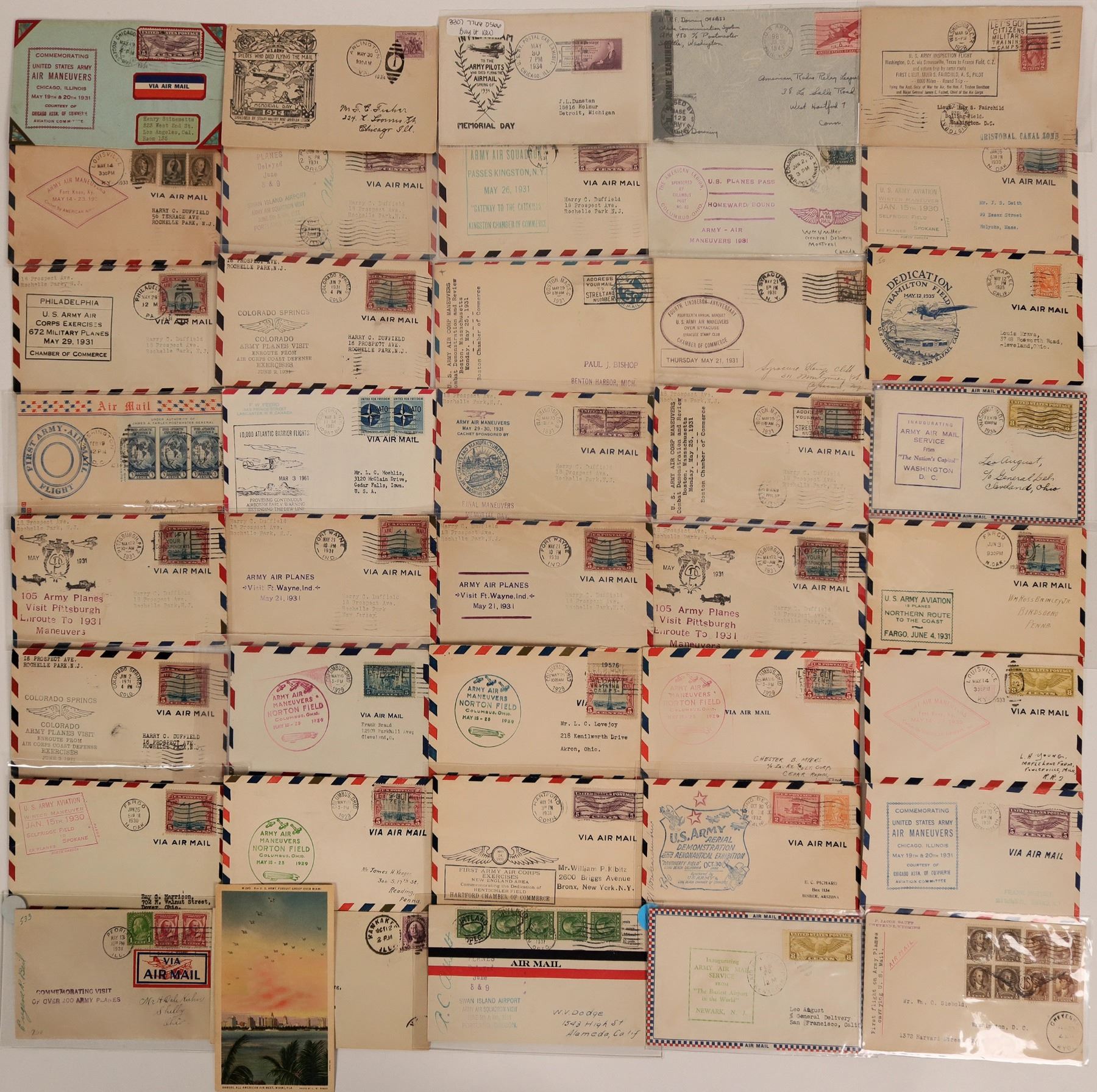 Army Aviation Air Mail, stamped letter assortment; envelopes in sleeves postmarked mostly in early 1930s; Air Manuevers -Ohio, Spokane,Long Beach,Rentschler Field, New England Area, Chicago, FargoD.C. , fort Wayne Indiana, Pittsburg, Colorado Springs, Oregon, D.c., Iowa;Syracuse, NY, most are from 1931-1934; post card m-235 8th US Army Pursuit Group Over Miami, Annual All American Air meet, colored illustration , Curt Teicght Co., Chicago