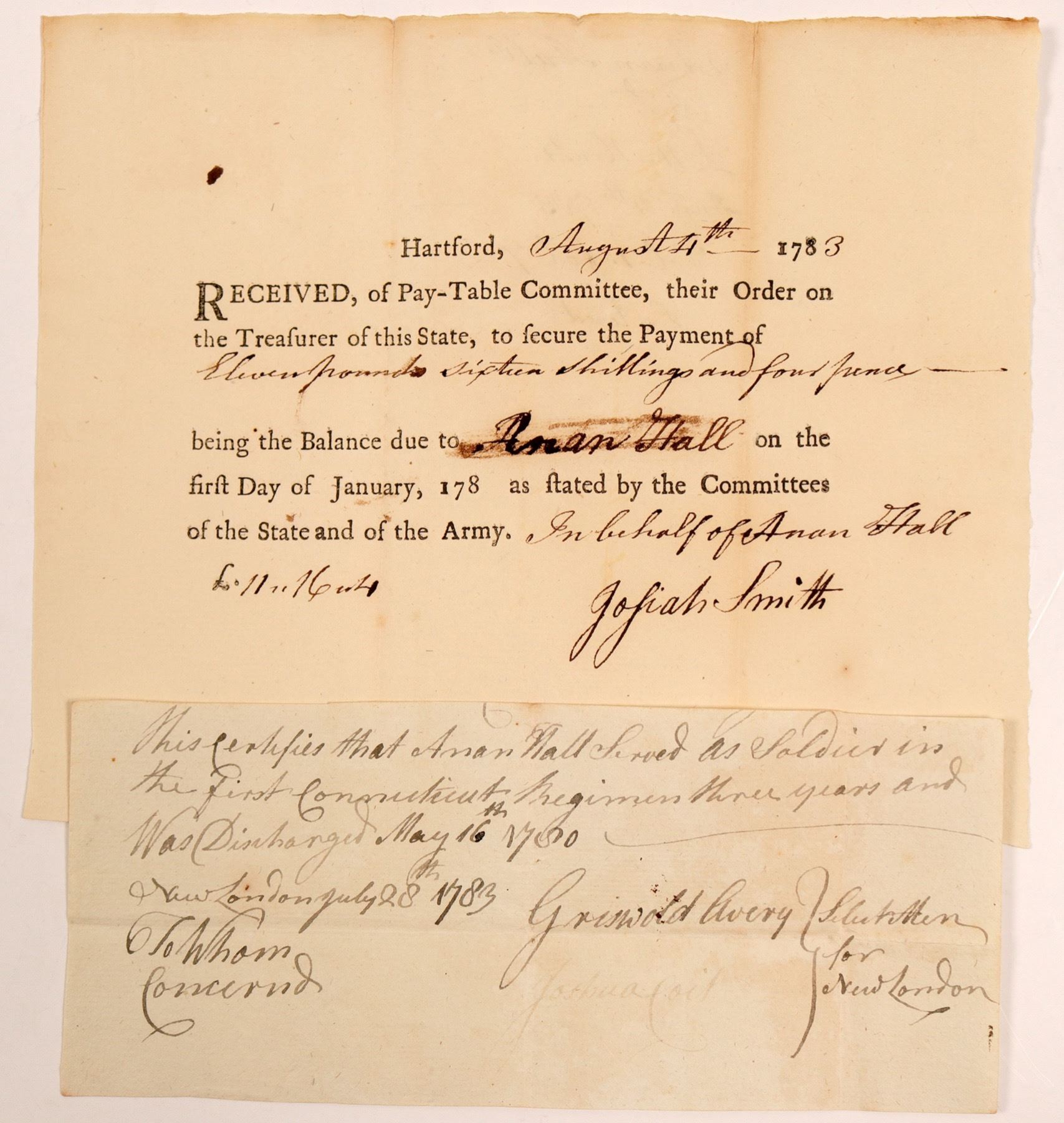 Pay order to Anan? Hall, a Revolutionary war soldier, signed by Jojia? Hall. 6.47x8". Small Letter stating Anan Hall served in First Connecticut regiment 3 years and was discharged . 3.5x7.25". Signed by Griswold Avery.