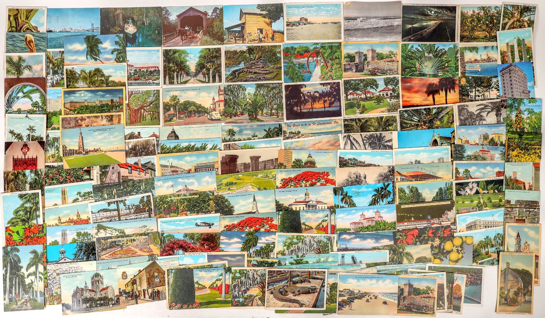 lot of 130+. One B/W RPC. Color, borderless and wht/amber borders. One bi-fold card has a map of Florida by AAA. Postmarks : Jacksonville, Pensacola, West Palm Beach, Miami, Tampa, Wenatchee Wa. ( 1 1/2 cent Martha Washington stamp), Daytona Beach, Bristol VA., St Louis MO.. One card ha non-cancelled 1 cent Washington stamp. Street level view : Alligators, Churches, Beaches, Ft Marion St Augustine, gov't bldgs., Tampa street scene, Downtown Jacksonville from St John's river, old covered bridge, Hotel Ponce De Leon St Augustine. Birdseye view: Port of Jacksonville, Miami, Overseas highway to Key West. Florida 1020-60 Ken Prag Collection