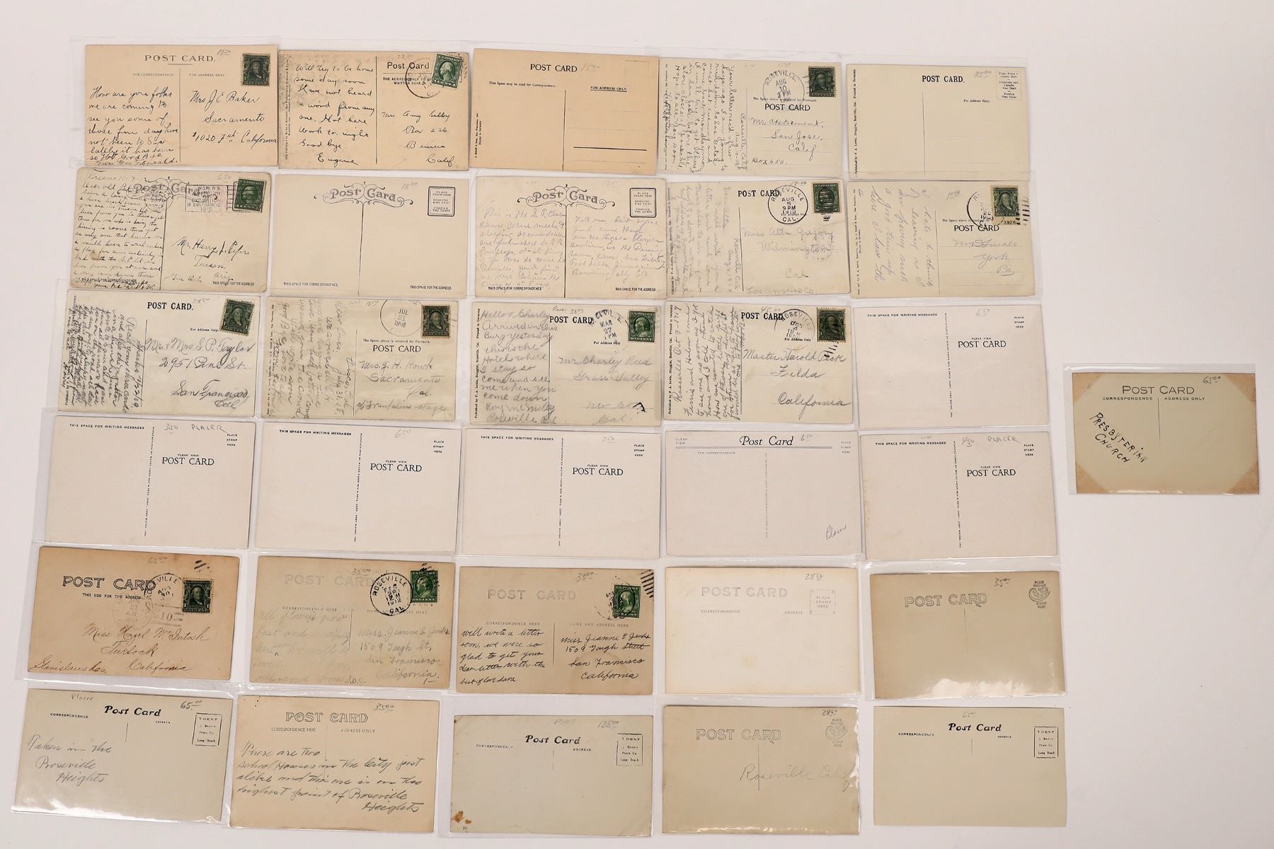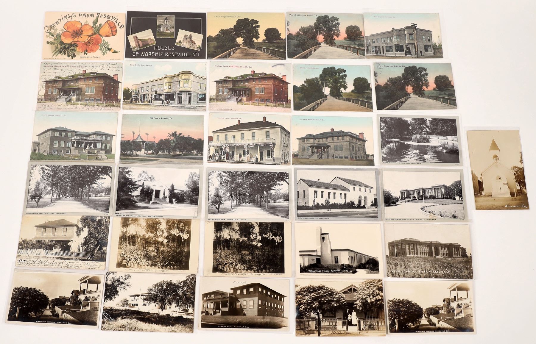 lot of 31. Seven RPC's, One pre-split. Wht. borders, silver framed and borderless. Postmarks: 1915 San FranExpo stamp, Fresno, Roseville. Street Level View: High school, The Plaza, churches, Hotel Romona, Western Hotel (1900era), John Doyles Residence, banks, parks, city hall. All in protective sleeves. California Rodeville 1908-15 Ken Prag Collection