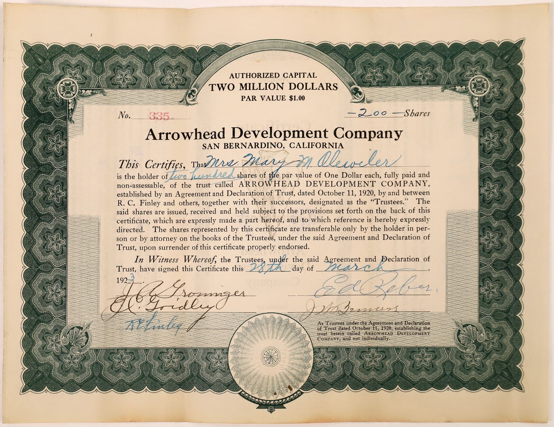No. 335, issued for 200 shares to Mrs. Mary Olewiler in 1923. Signed by five trustees. Green border, black print, and underprint vignette of an arrowhead. Also has an arrowhead incorporated into the seal. Folds, some toning, holes in seal. 9 x 12" Original developer of Lake Arrowhead in San Bernardino County, California. The community was known as Little Bear Lake until 1920, when the Arrowhead Lake Company bought the land and changed the name to Lake Arrowhead.