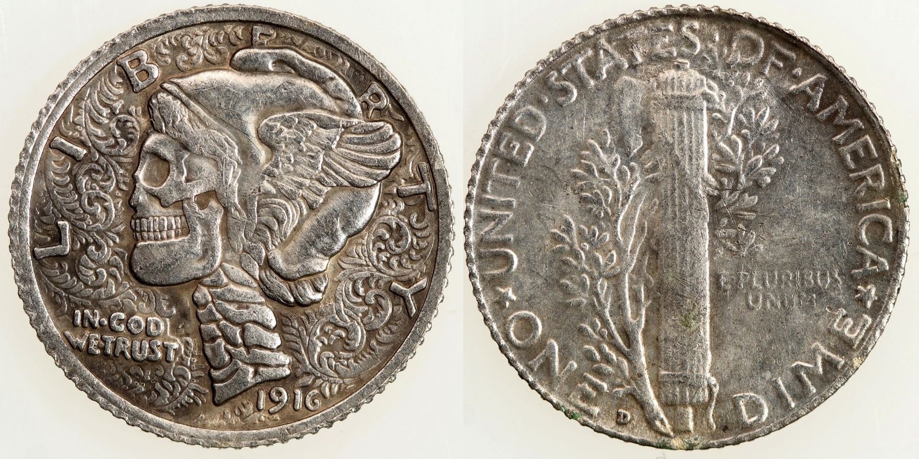 Unique carved coin making the Mercury head into a skeleton and graffiti in the field. More interesting is the 1916-D date, the rarest of all Mercury dimes. Worthy of close inspection, We can't tell if its original or not, you guys can decide for yourself.