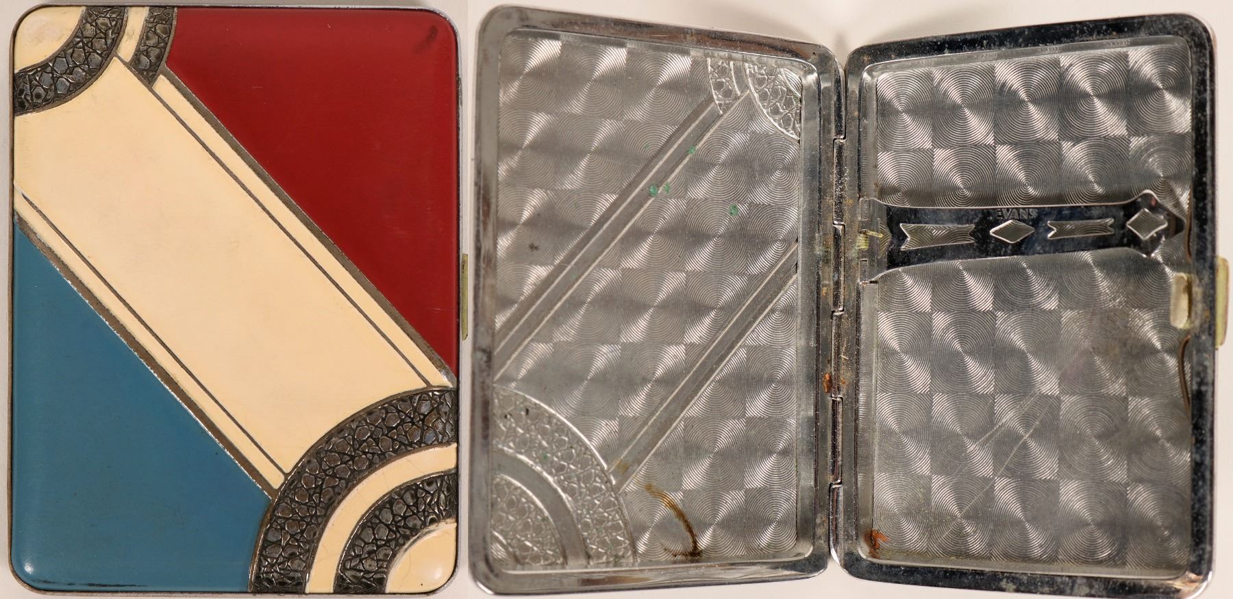 This is an art deco women's cigarette case 2.5 in. X 3.5 in. made by Evans. It is enameled in blue, cream, and red colors, nickel plated with a jeweled interior. C. 1930's.