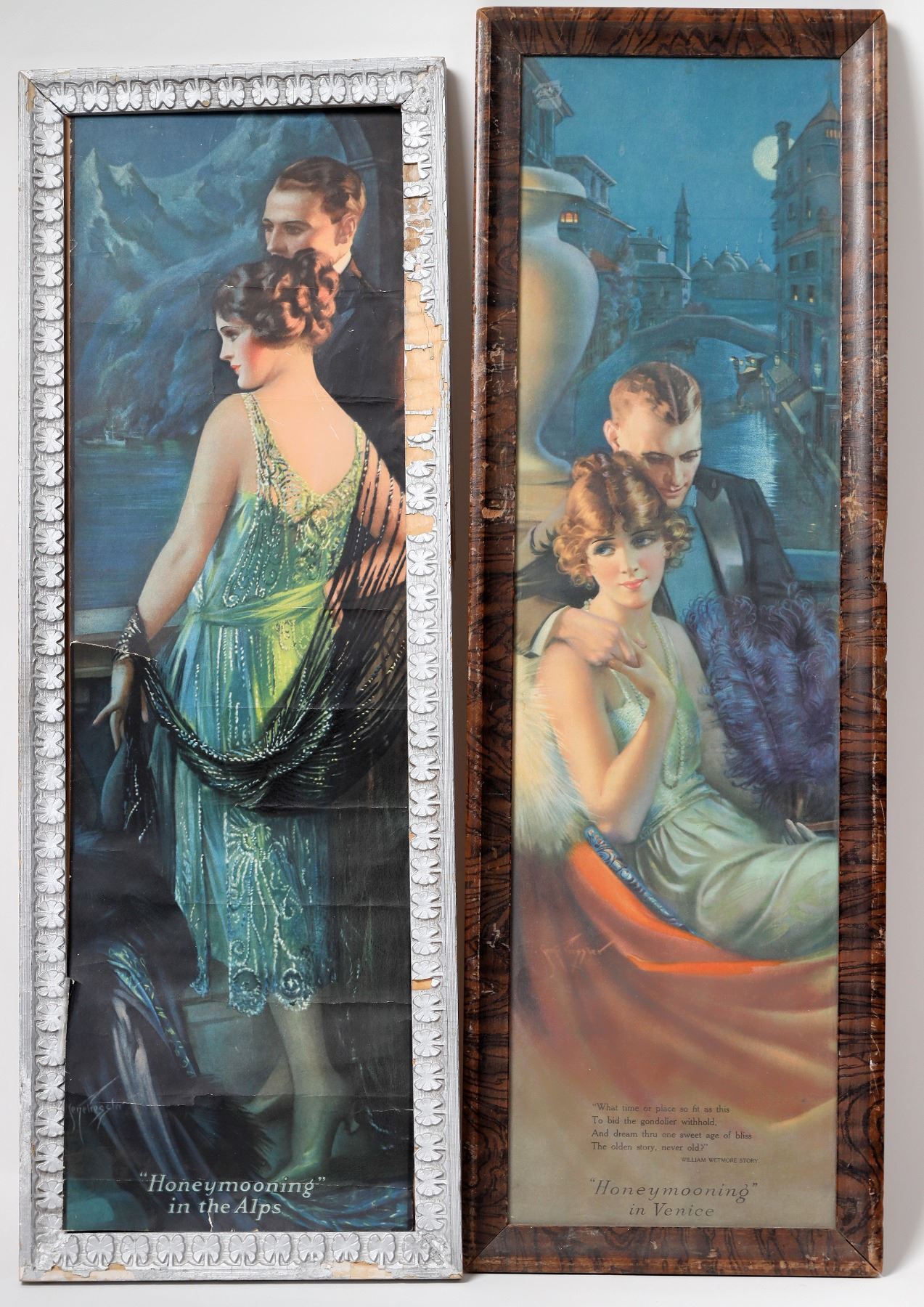 2 Art Deco prints of a man and a woman. Honeymoon in the Alps and Honeymoon in Venice. Frames have condition issues. Honeymoon in the Alps has creases and small tears. Both about 27.5x9".