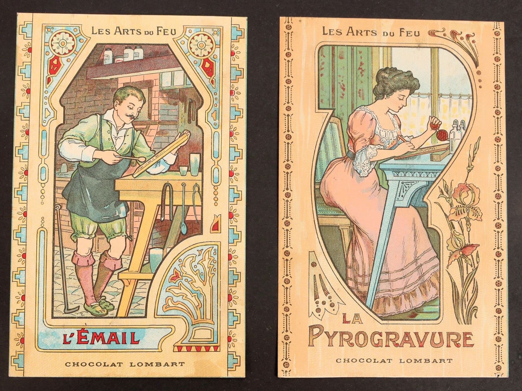 A pair of French Art Nouveau postcards featuring advertisements for chocolate, c1900-10. Color lithographs of a woman, titled "La Pyrogravure," and a man, titled "L'Email," creating chocolates, by the Chocolat Lombart company. "Les Arts du Feu" printed above the illustrations. Company insignia on verso. Unused. Light staining, mostly on the backs. [