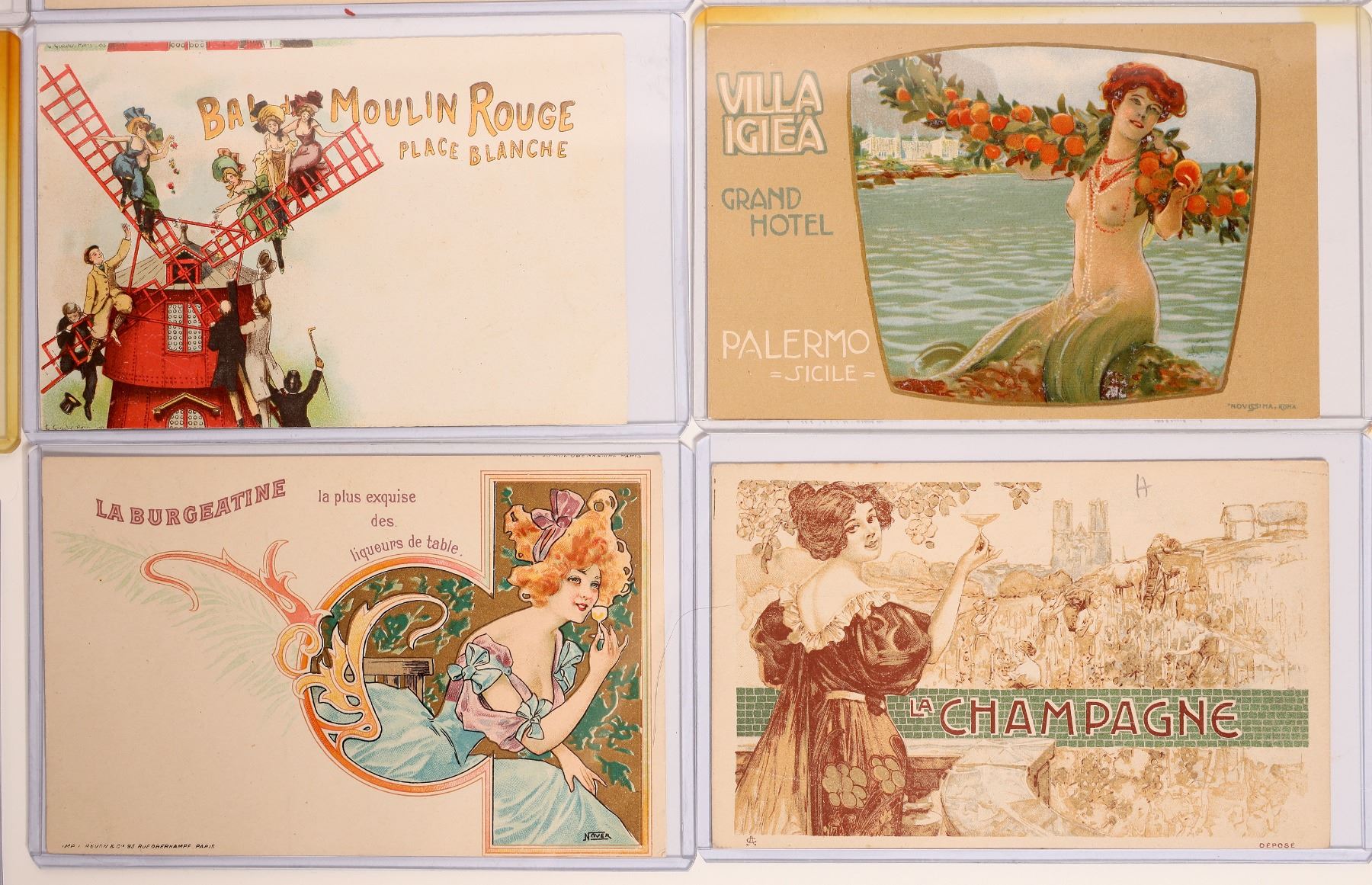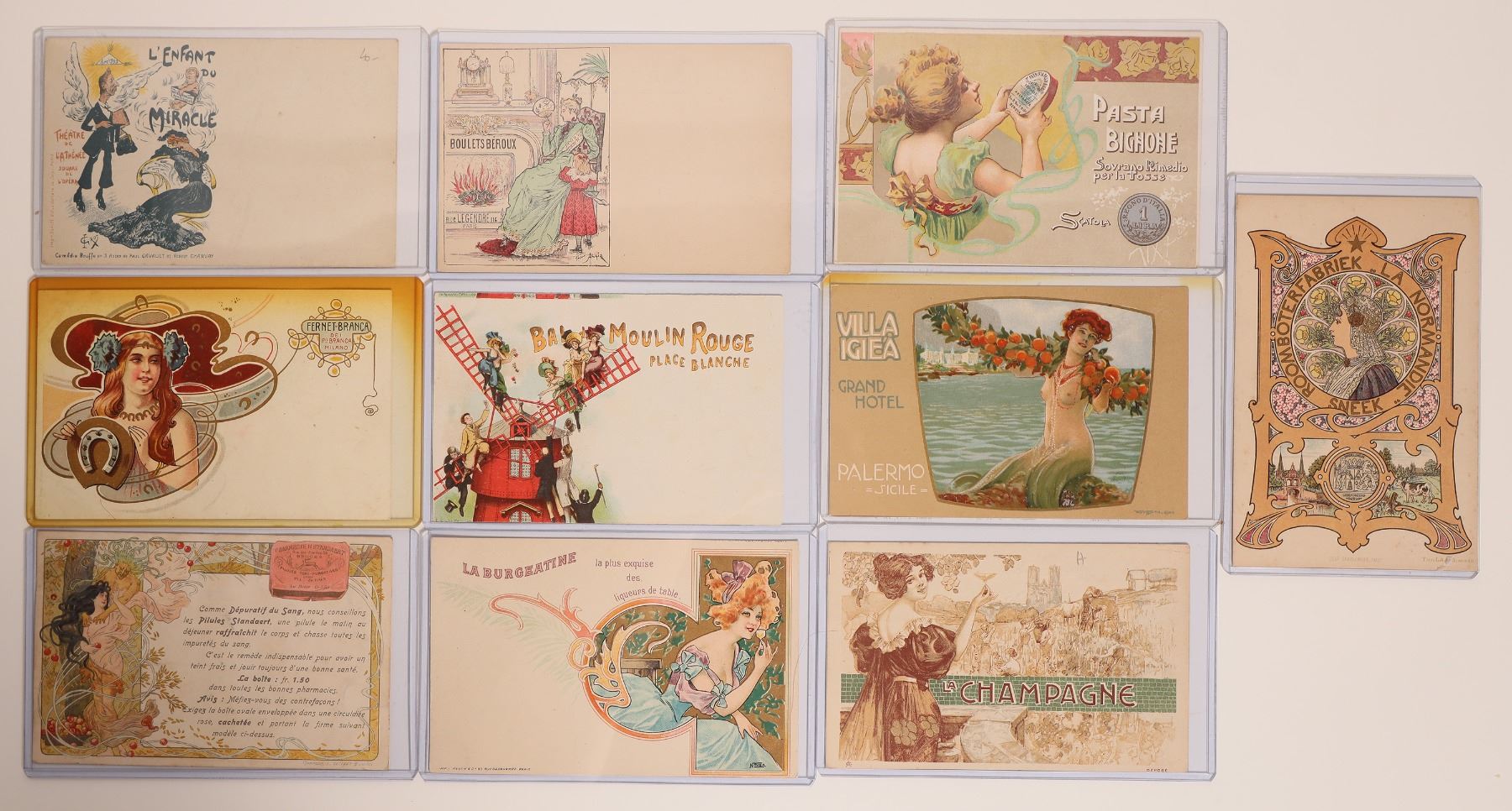 A collection of 10 European advertising postcards featuring the art nouveau style, circa early 1900s. EXEMPLARY. Publishers include: J. E. Goffart, Bruxeiles; Glass B. Rue Bochard de Seron, Paris; etc. 8 unused, 2 with postmarks and stamps.