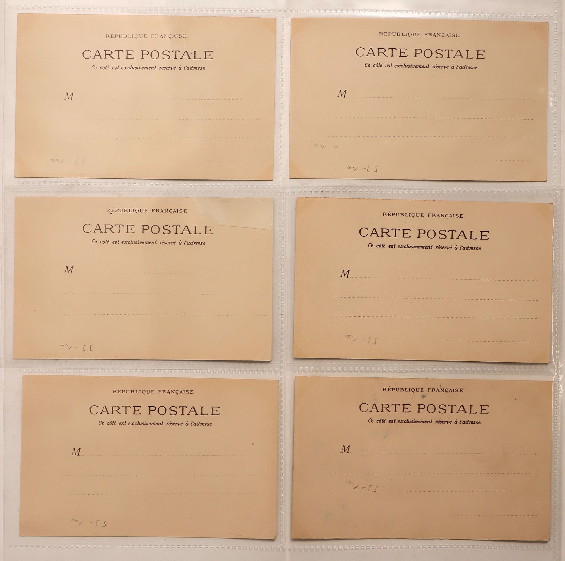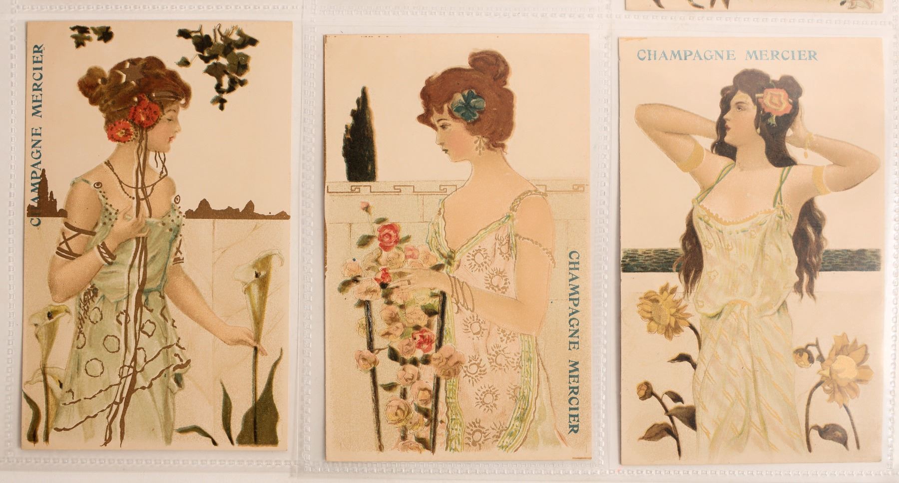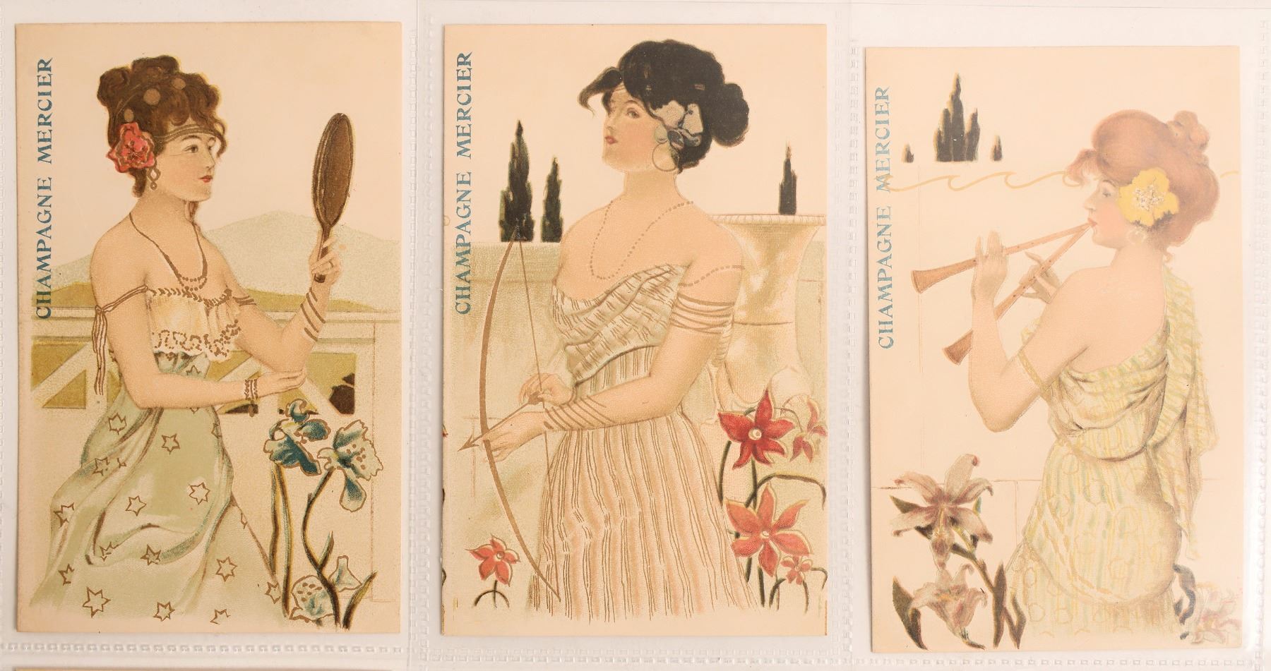 A complete set of 6 French advertising Art Nouveau postcards by Champagne Mercier. Series of women in various poses, holding a mirror, flute, bow and arrow, etc. "Republique Francaise/Carte Postale/Ce cote set exclusivement reserve a l'adresse" printed on backs. All unused with light pencil marks on verso, otherwise clean. In 1871 Eug¯ne Mercier began the construction of his cellars in Epernay. It took six years to build. Once the cellars were open, Eug¯ne Mercier had visitors tour the tunnels in carriages pulled by four horses. To this day the Mercier cellars hold tours and receive over 100,000 visitors every year.