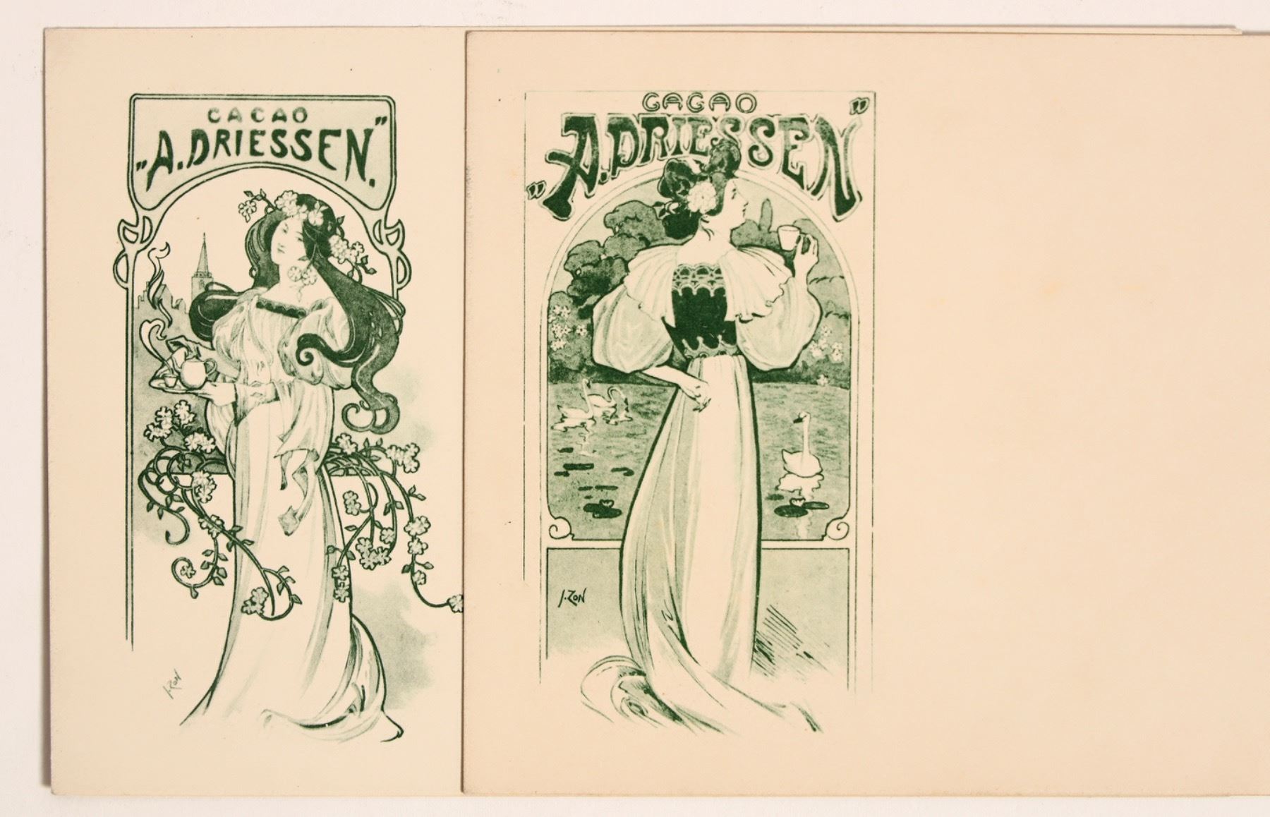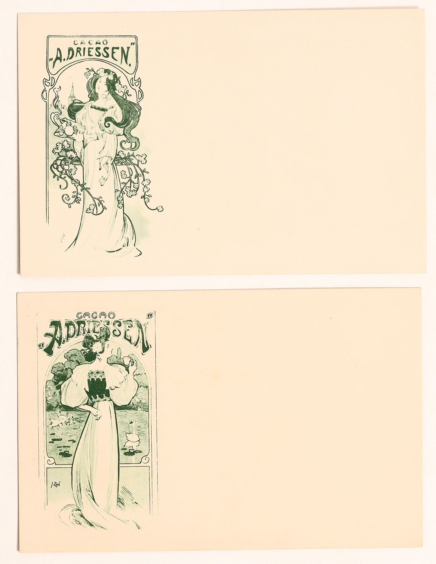 A pair of French Art Nouveau postcards with advertisements for the chocolate company, "Cacao A. Driessen," c1900-10. Illustrations of women cover about one third of the fronts. Unused.[