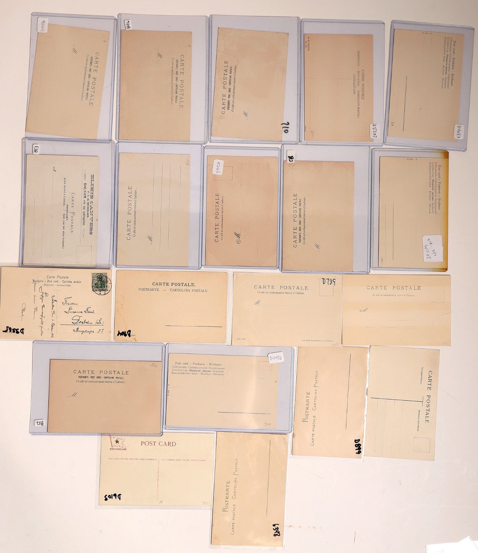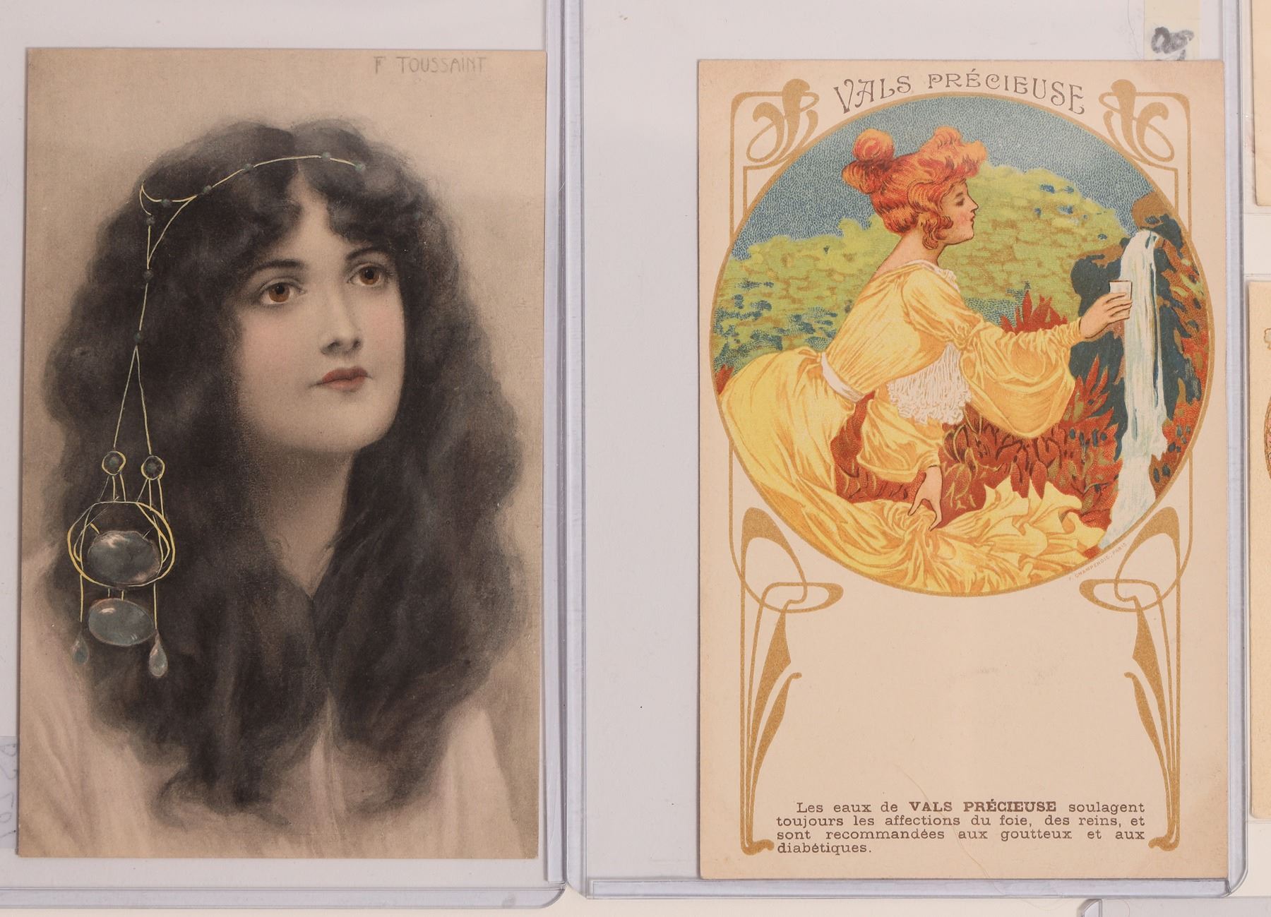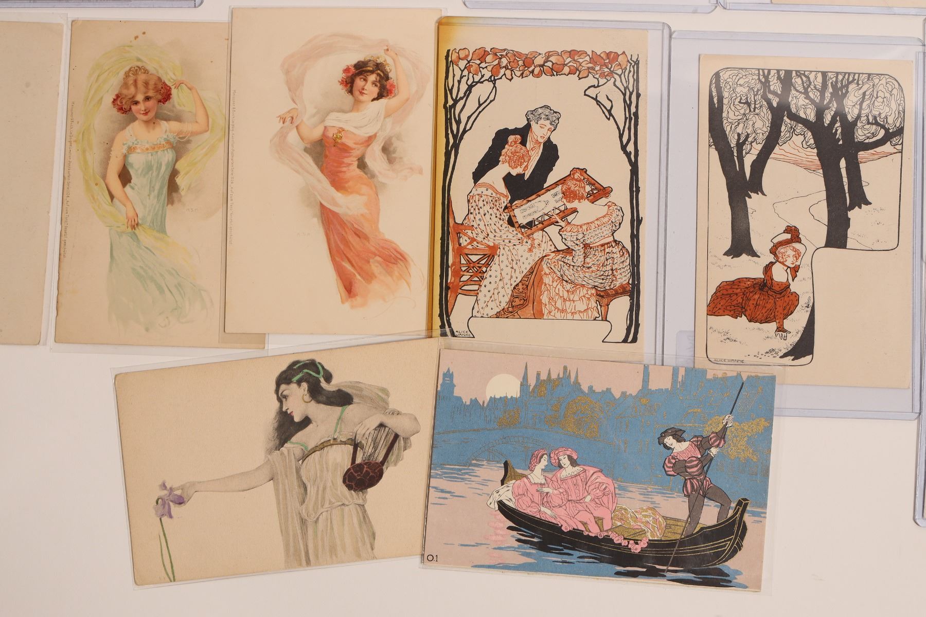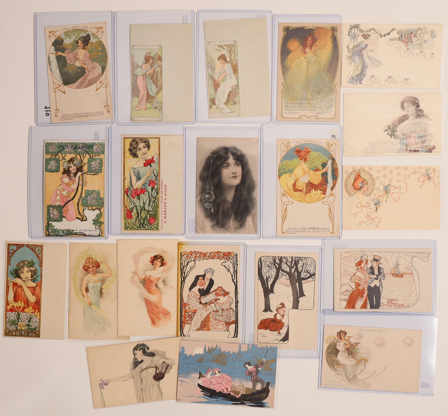 A collection of 20 various postcards featuring illustrations in the art nouveau style, c1900s. All unused except 1 postmarked 1905. Clean.