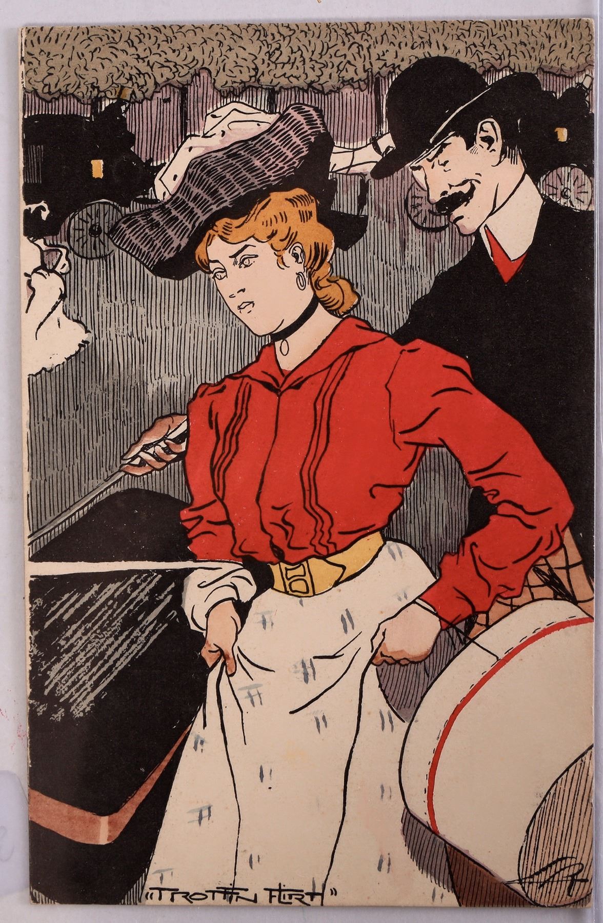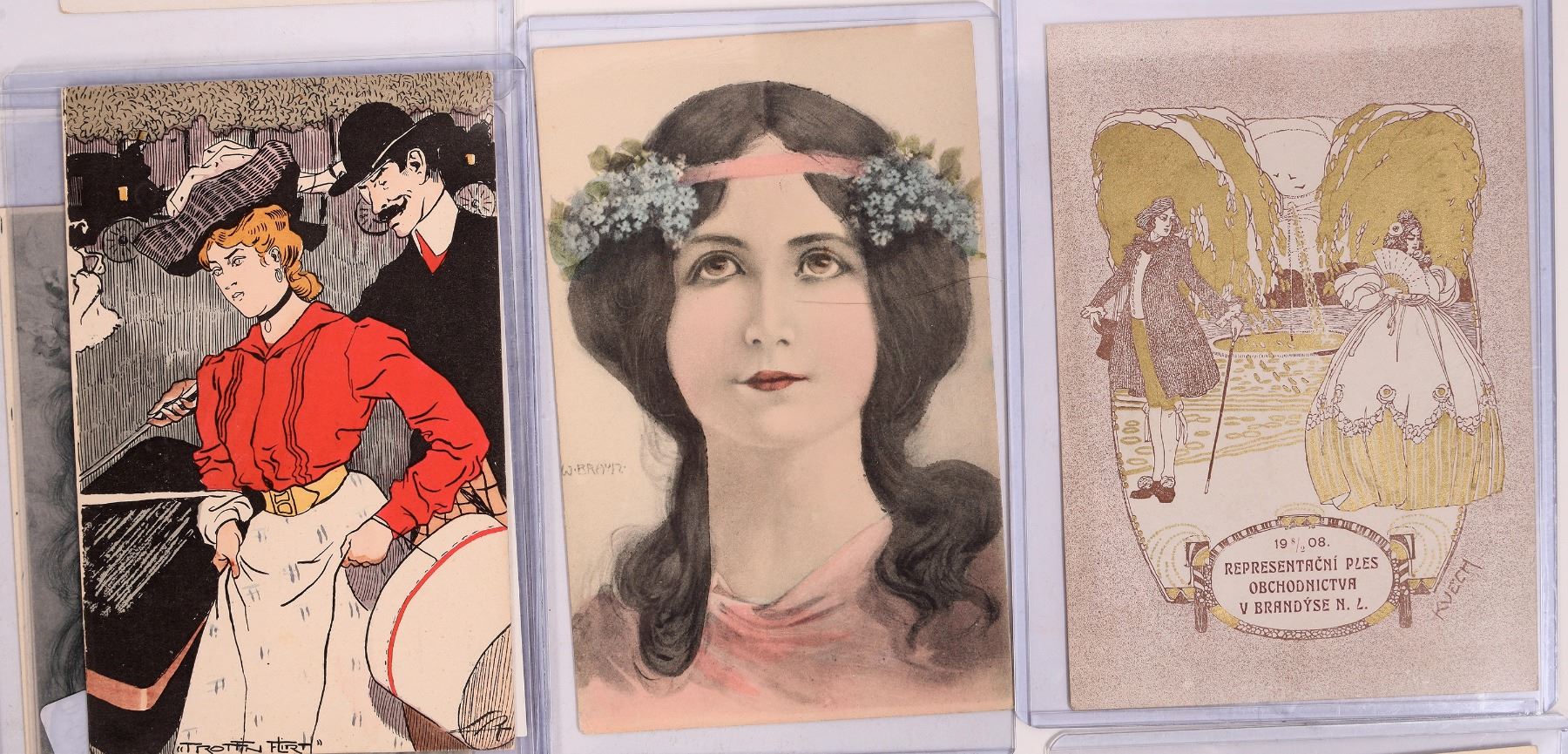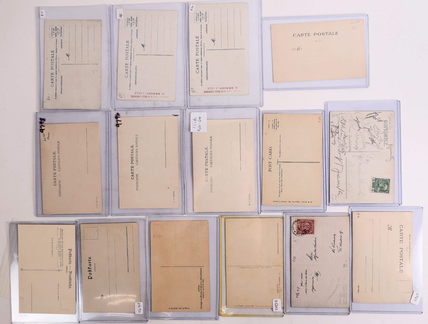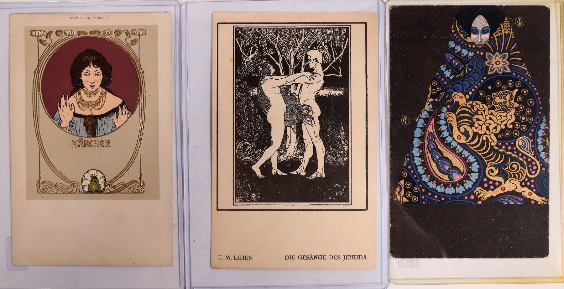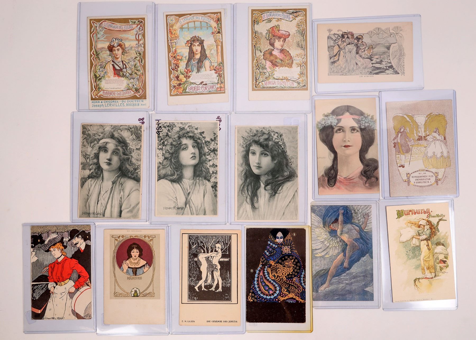 A collection of 15 various postcards featuring illustrations in the art nouveau style, c1900s. All unused except 2 with stamps and penned writing on verso (1 postmarked, date illegible). Nice assortment. Clean.