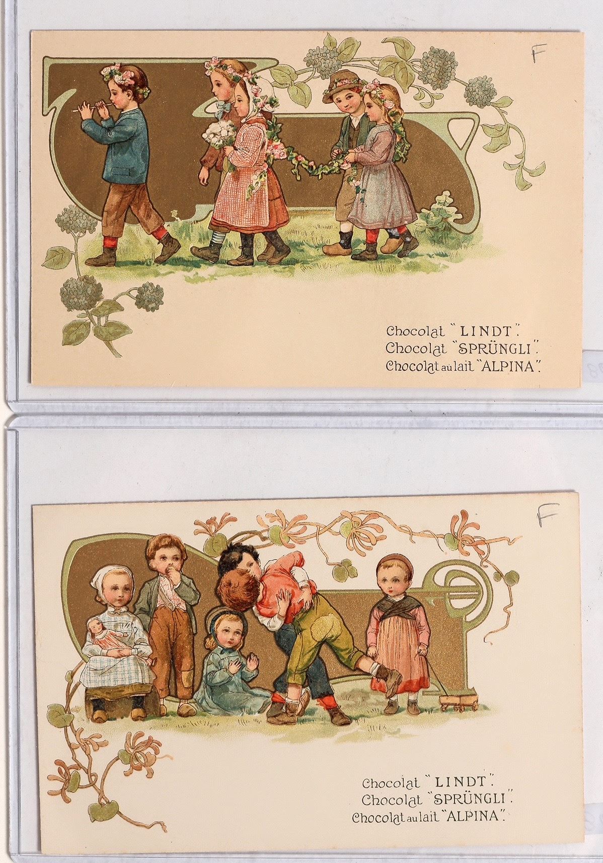 A pair of French Art Nouveau postcards which are advertisements for chocolates, c1900-10. Color litho and gold gilt illustrations of children playing and "Chocolat 'Lindt,' Chocolat 'Spr¸ngli,' Chocolat au lait 'Alpina' printed on fronts. Unused. Light color bleed through to verso.[