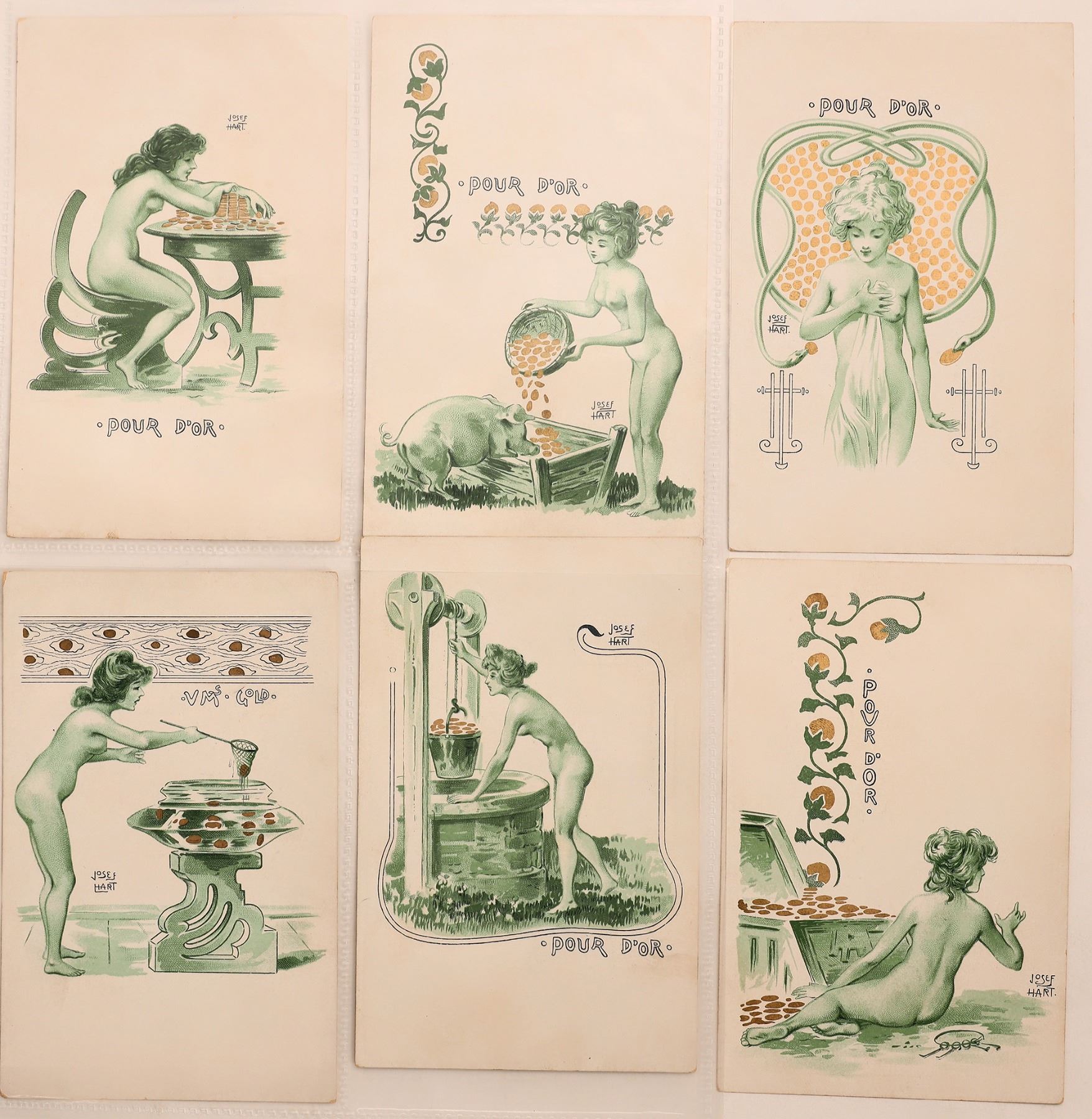 A set of 6 different Art Nouveau postcards featuring the illustrations of Josef Hart, circa early 1900s. Illustration in green of nude woman with gilt gold coins. Five with printed titles on front "Pour D'Or," one titled "-VMs - Gold-". All unused. Light foxing and staining, otherwise clean. For more information on the Art Nouveau movement, see Lot #185447.