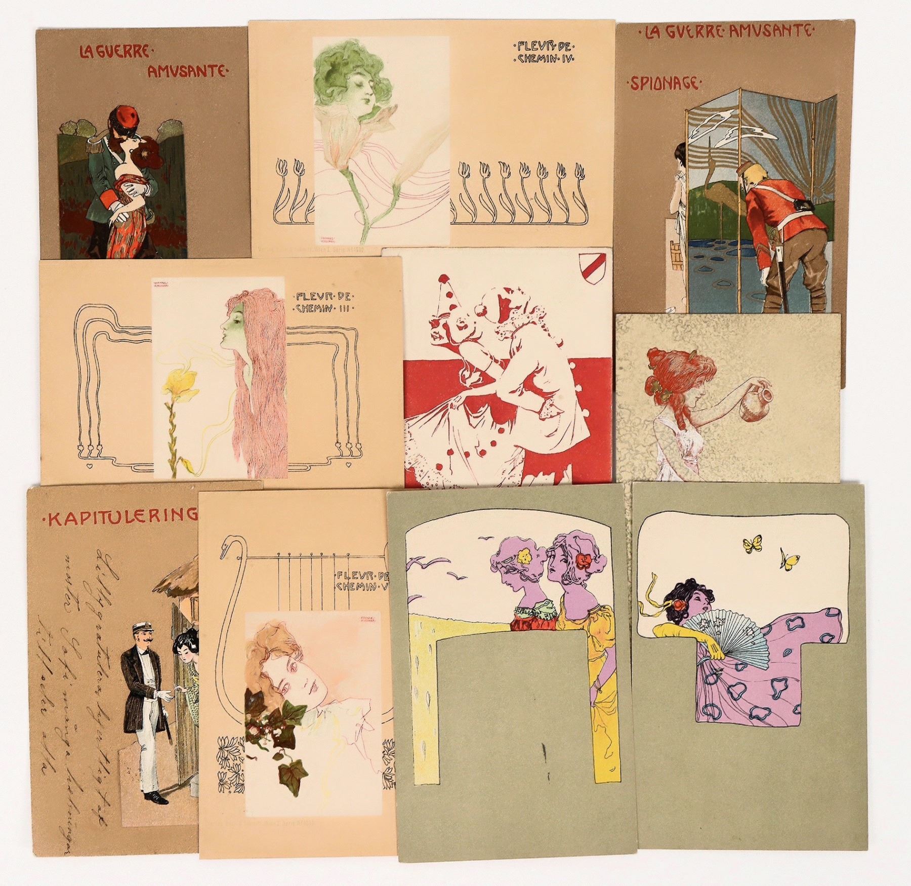 Collection of 10 postcards featuring Art Nouveau illustrations by Raphael Kirchner and Max Raschka, c1899-1906. Selections by Raphael Kirchner: 1899 ESW (Austria) Pierrot & Clown in red & white, unused; Fleur De Chemin III, IV & V, postmarked 1899; 1901 Girls With Olive Green Surrounds (2), unused, some foxing and fading due to being in album on verso; and Unknown artist, possibly Kirchner, of Greek Girl Pouring Wine. Also 3 color lithographed Kirchner postcards signed by M. (Max) Raschka - 2 unused from La Guerre Amusante series, c1900, 1 from Kapitulering series, postmarked 1906. Please see photo(s) for more details. See Lot #18154 for Kirchner's biography and Art Nouveau history. [ 1899-1906