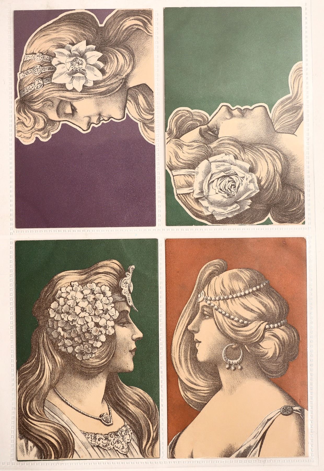 A set of 4 Art Nouveau postcards attributed to Kosa, who produced illustrations on postcards in the early 1900s. Brightly colored backgrounds contrast with neutral-toned figures of women. All have publishers information printed on verso, "H.M. & Co. Series 4519 - Printed in Prussia." Unused. Light foxing and small pencil marks on verso, otherwise clean. [] [] [Europe] [] []