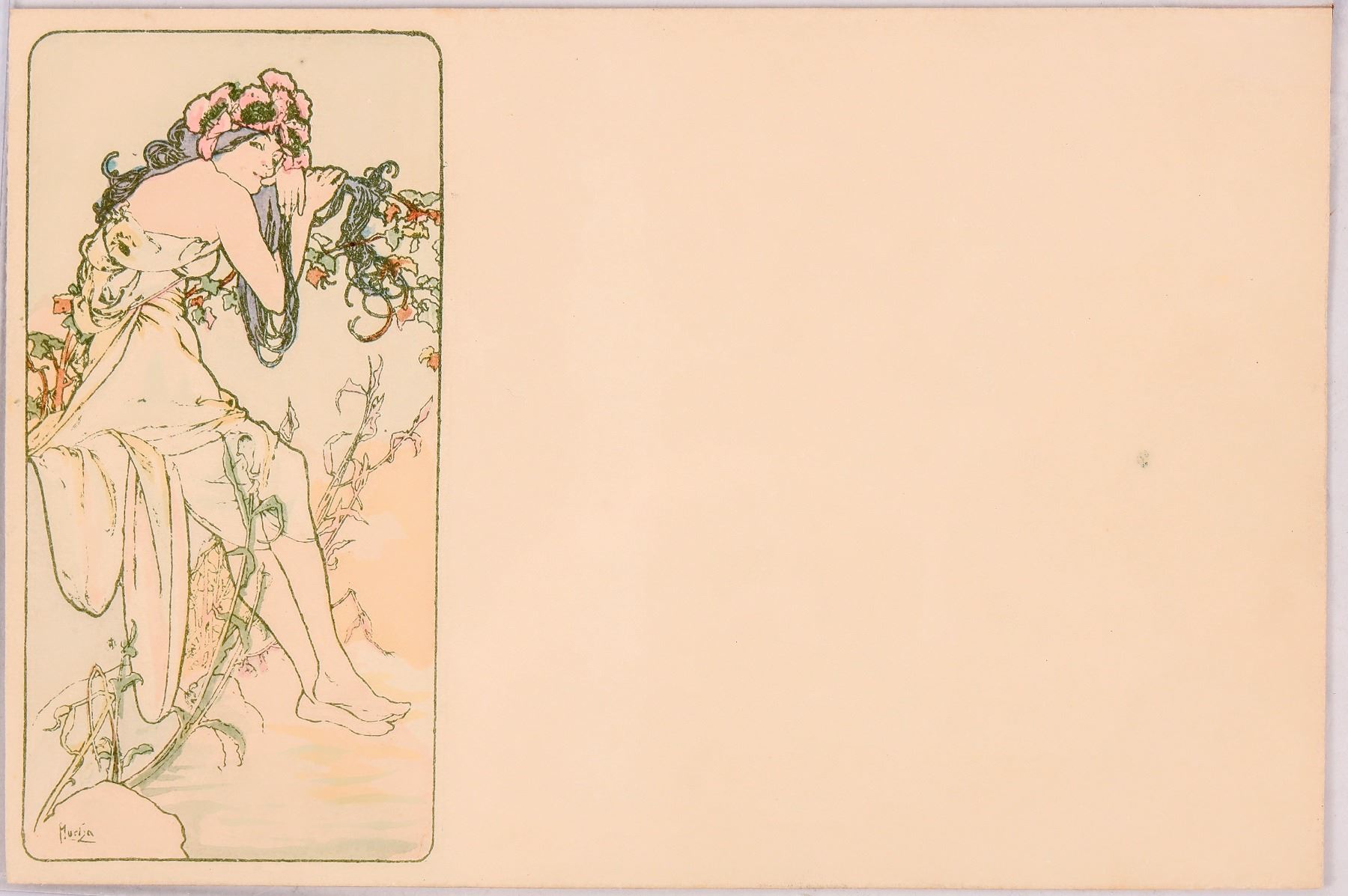 This postcard is part of Alphonse Mucha's 1st series of 12 cards which comprises three groups of four cards each. The first is of the seasons (in French, saisons). No. 402, Autumn. R-2. From the set of the four seasons published by Champenois in 1900. Lady with long black hair in white dress; body turned to the right. Light pencil marks on verso, otherwise clean.