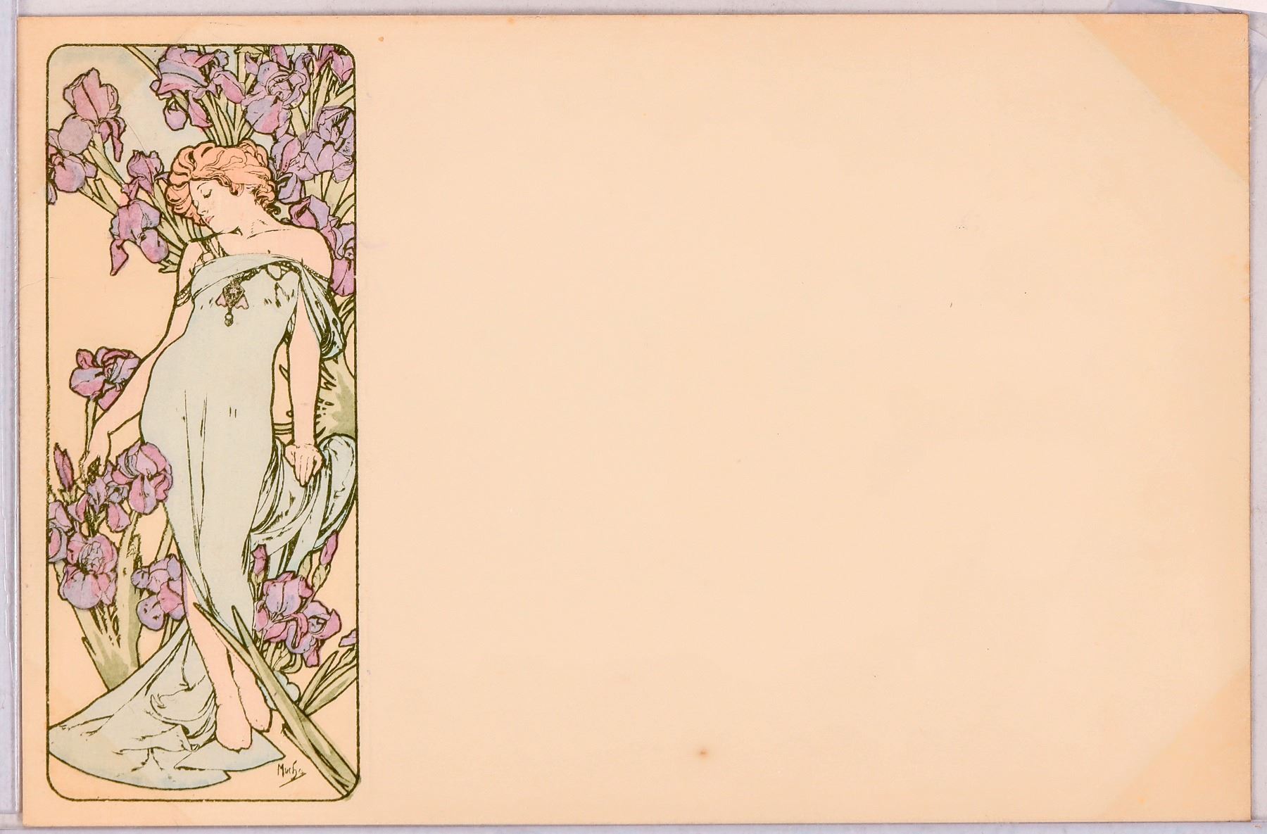 This postcard is part of Alphonse Mucha's 1st series of 12 cards which comprises three groups of four cards each. The second group in the 1st Series is of four flowers and was originally titled Les Fleurs. No. 406, Irises. R-2. From the set of four flowers published by Champenois in 1900. Lady in blue dress. Irises in background. Two postmarks, stamp, penned address on verso. Light staining on corners from being in an album front and back.
