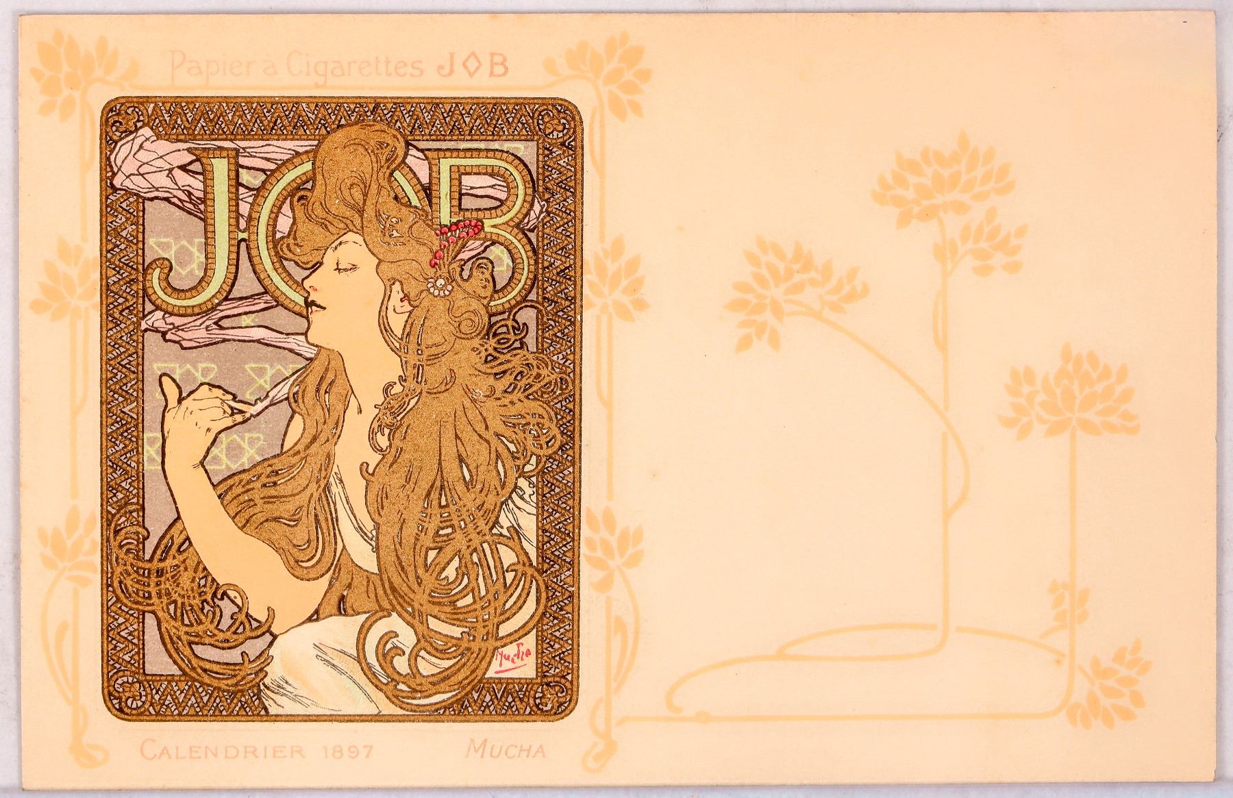 This Unlisted postcard is one of two subjects the JOB firm commissioned Alfonse Mucha to design. It illustrates a lady with long blonde hair in a white gown. The JOB name appears above in mosaic form, "Paper a Cigarettes JOB." The image appeared on a calendar as well as on a poster and in La Plume magazine. In its postcard form the image is titled "Calendrier 1897 Mucha," below the illustration. Postcard No. 171, "JOB calendar," is similar but without the "Calendrier 1897 Mucha" title. Nos. 172 & 173 are also similar. Unused. Minor pencil marking upper right on verso, otherwise clean.